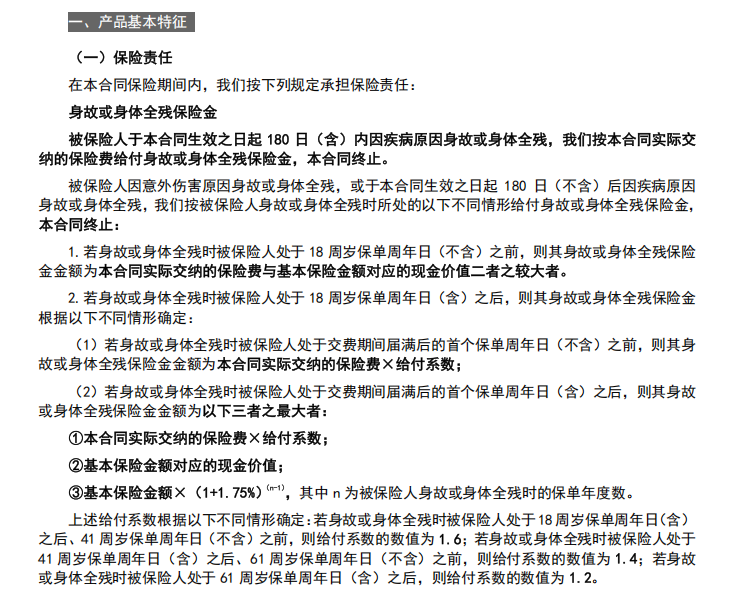18 周岁保单周年日(含)后至 41 周岁保单周年日(不含)前出险,给付系数为 1.6;41 周岁(含)至 61 周岁(不含)前系数为 1.4;61 周岁(含)后系数为 1.2。