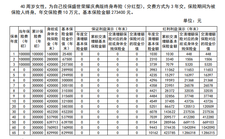 以 40 周岁女性选择 3 年交、年交 10 万元为例,第 3 年末基本保险金额现金价值达 207300 元,第 10 年末增至 321000 元,第 65 年末更是达到 829900 元。