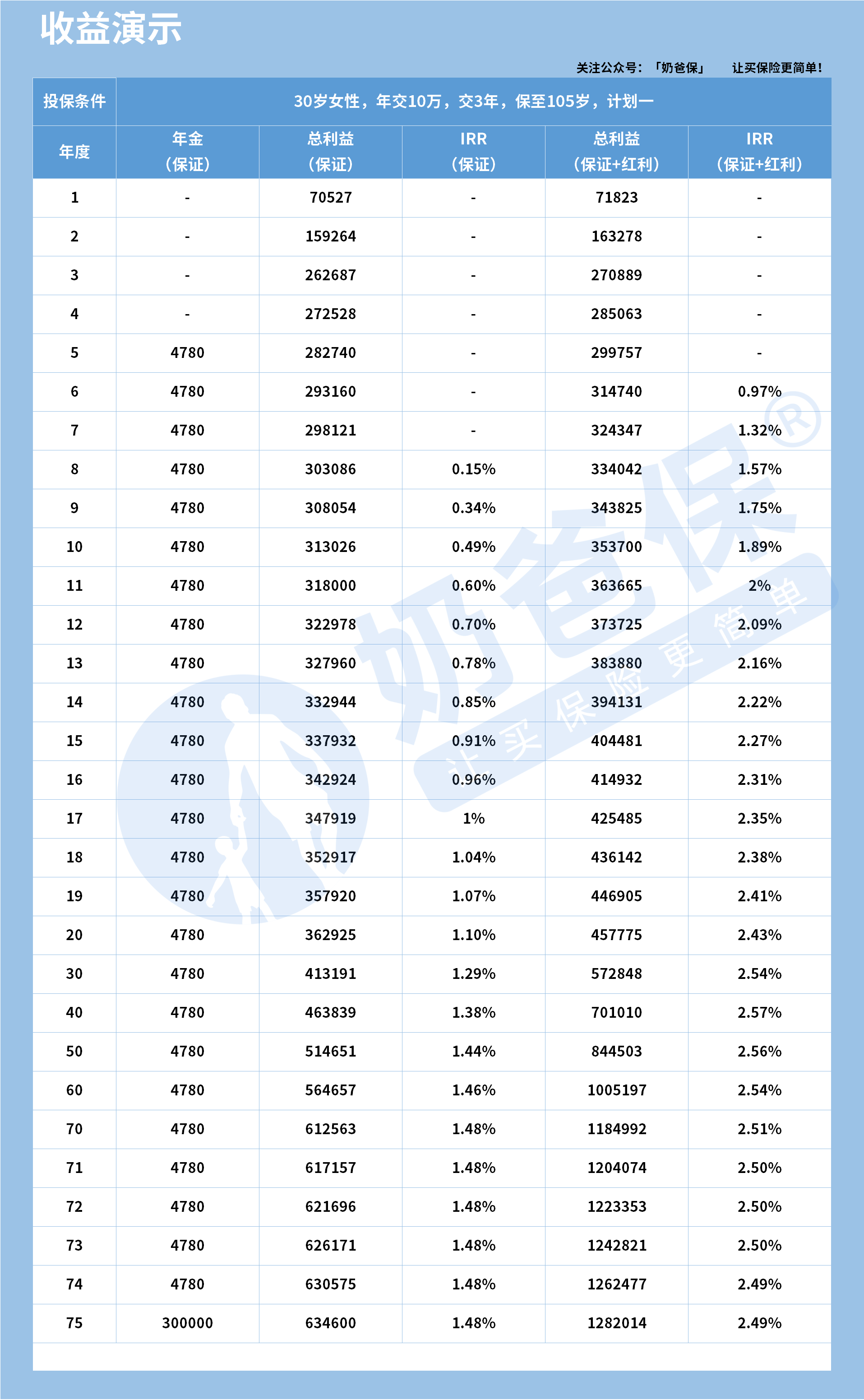 75年时保证总利益达634600元,对应的保证IRR(内部收益率)逐步升至1.48%并稳定,这部分是合同约定的“安全垫”,不受市场影响。