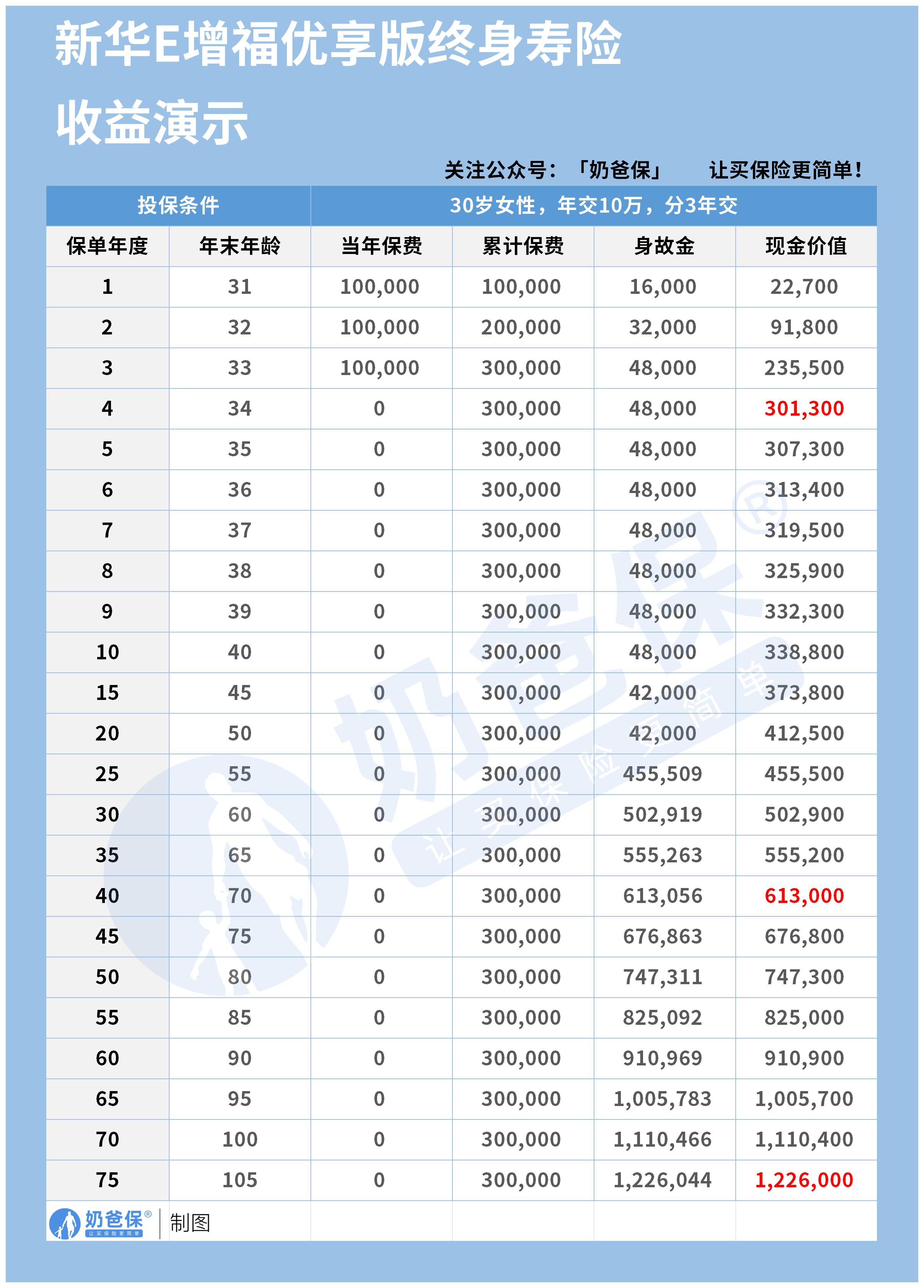 以“30岁女性,年交10万,分3年交(累计保费30万)”为例,带大家直观感受: