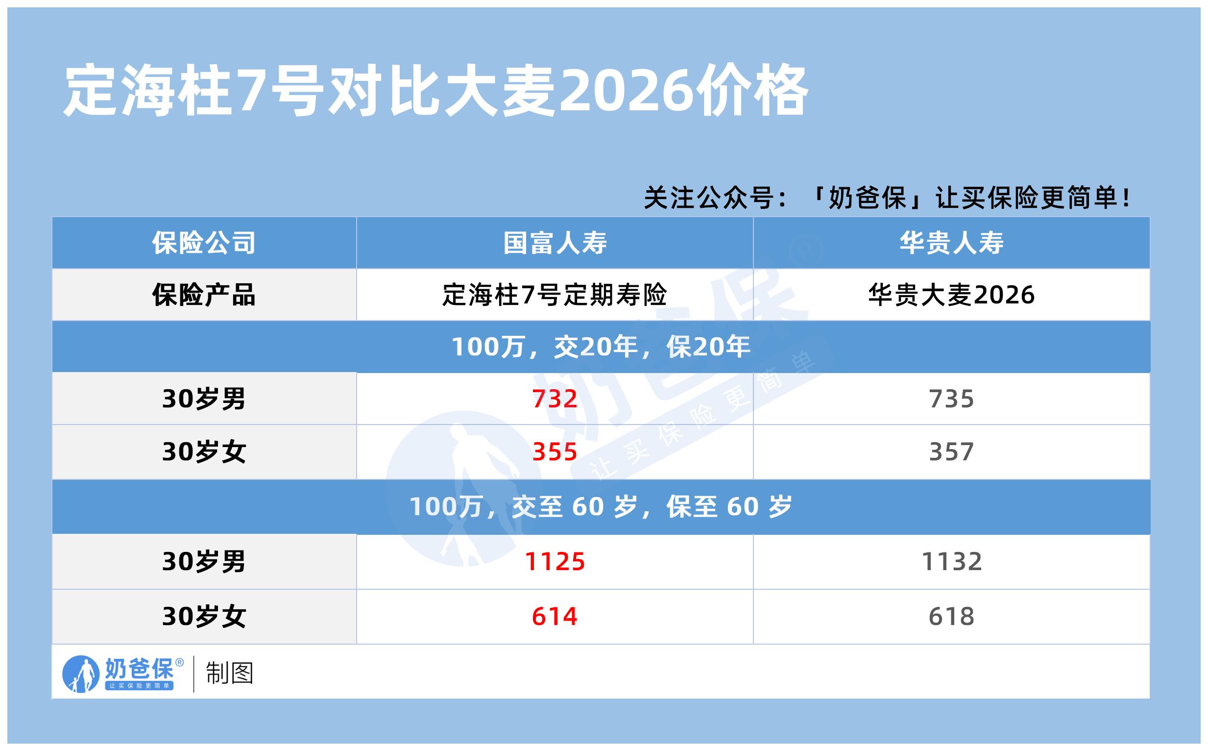 30岁男性:定海柱7号是1125元/年,大麦2026 是1132元/年;