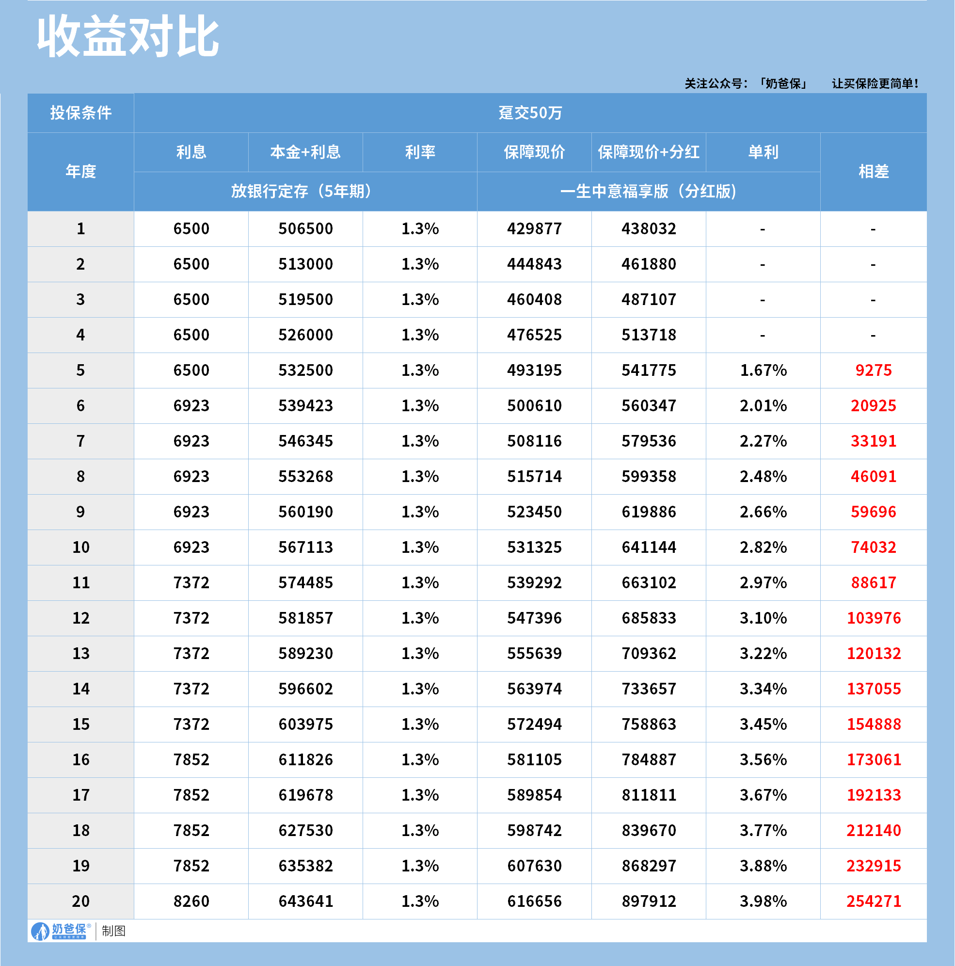 而如果是存银行定存,此时的本利和可能只有50多万,两者的差距直接关系到家人后续的生活保障。