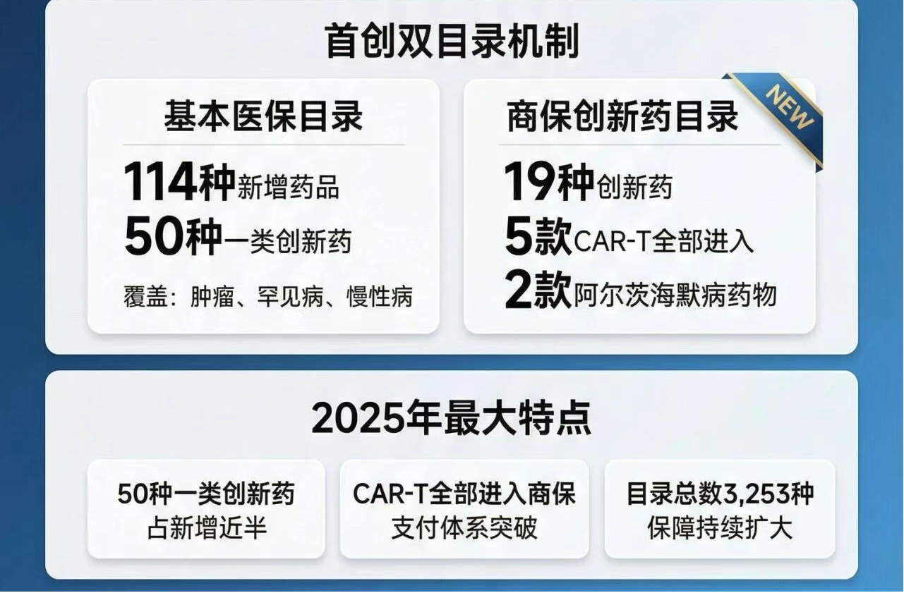还是12月,国家医保局发布了最新版《国家基本医疗保险、生育保险和工伤保险药品目录(2025年)》,以及我国首版《商业健康保险创新药品目录》,