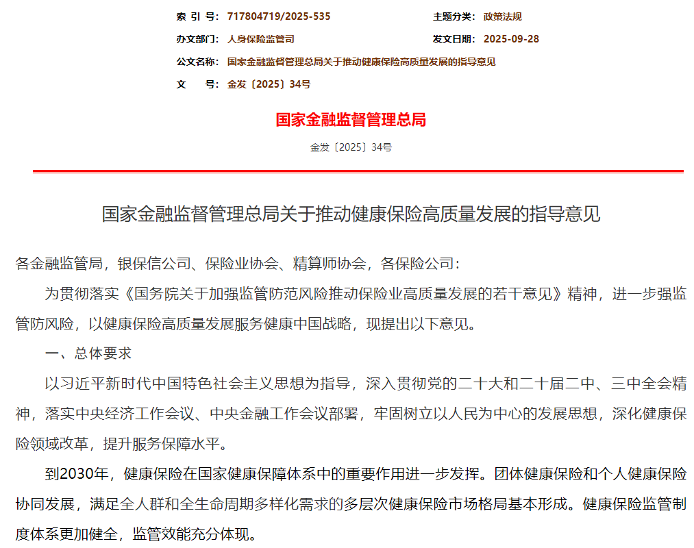 《关于推动健康保险高质量发展的指导意见》。