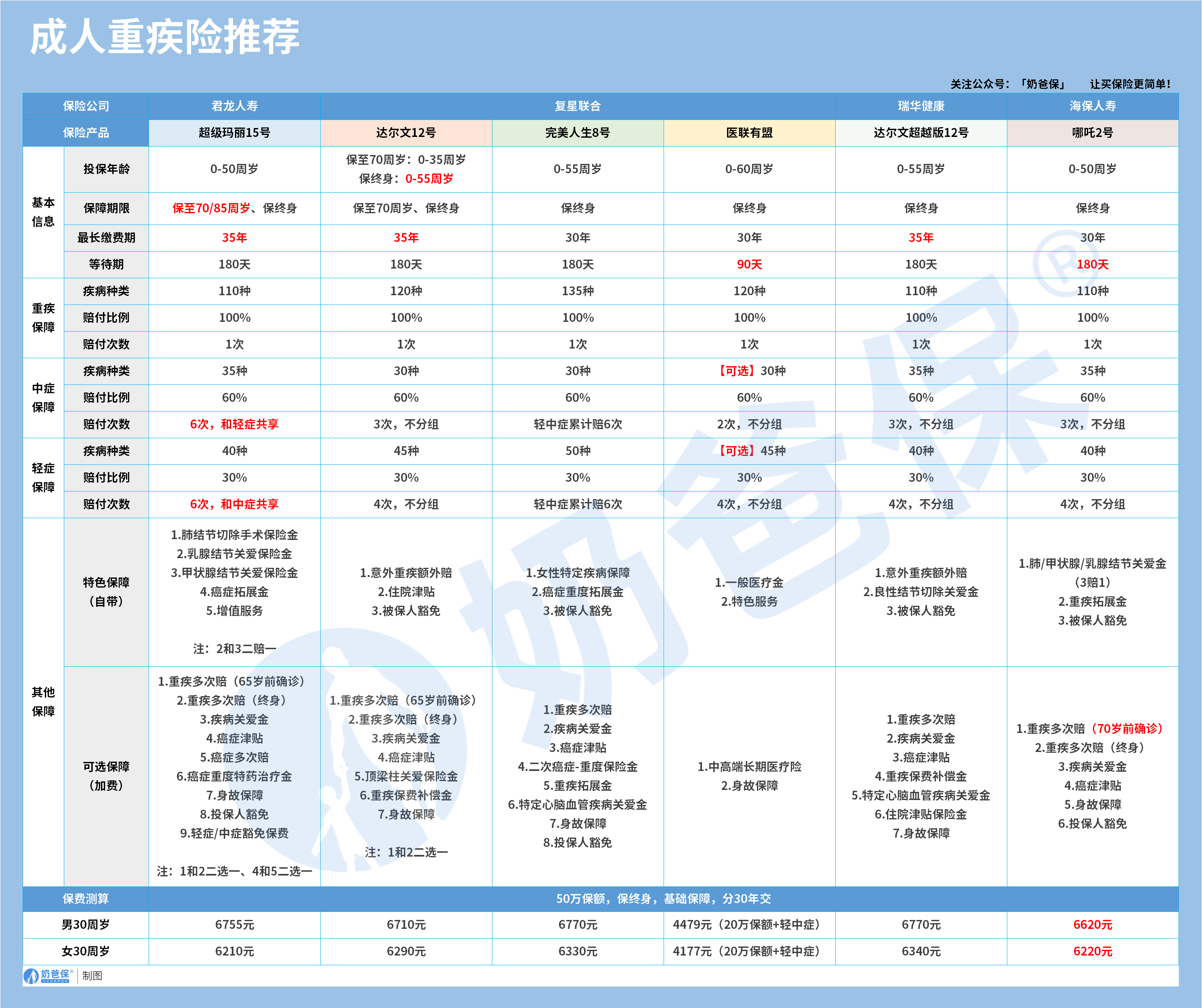 我根据保障内容、保费、核保宽松度等维度,汇总了最新一期重疾险推荐榜单,大人、小孩都有。