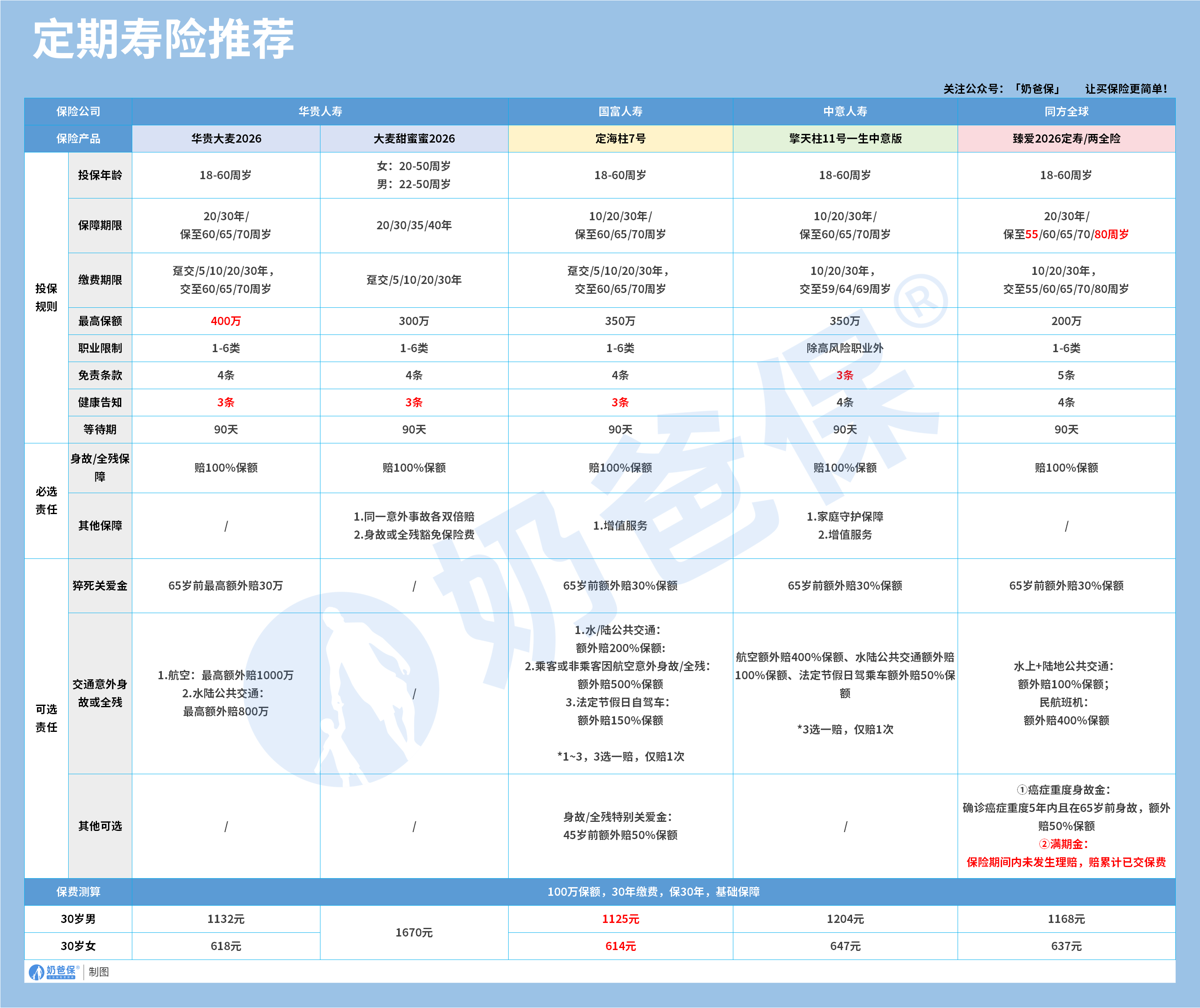 定期寿险只保身故和全残,很多人可能一辈子只买一次,所以买起来可不能含糊。