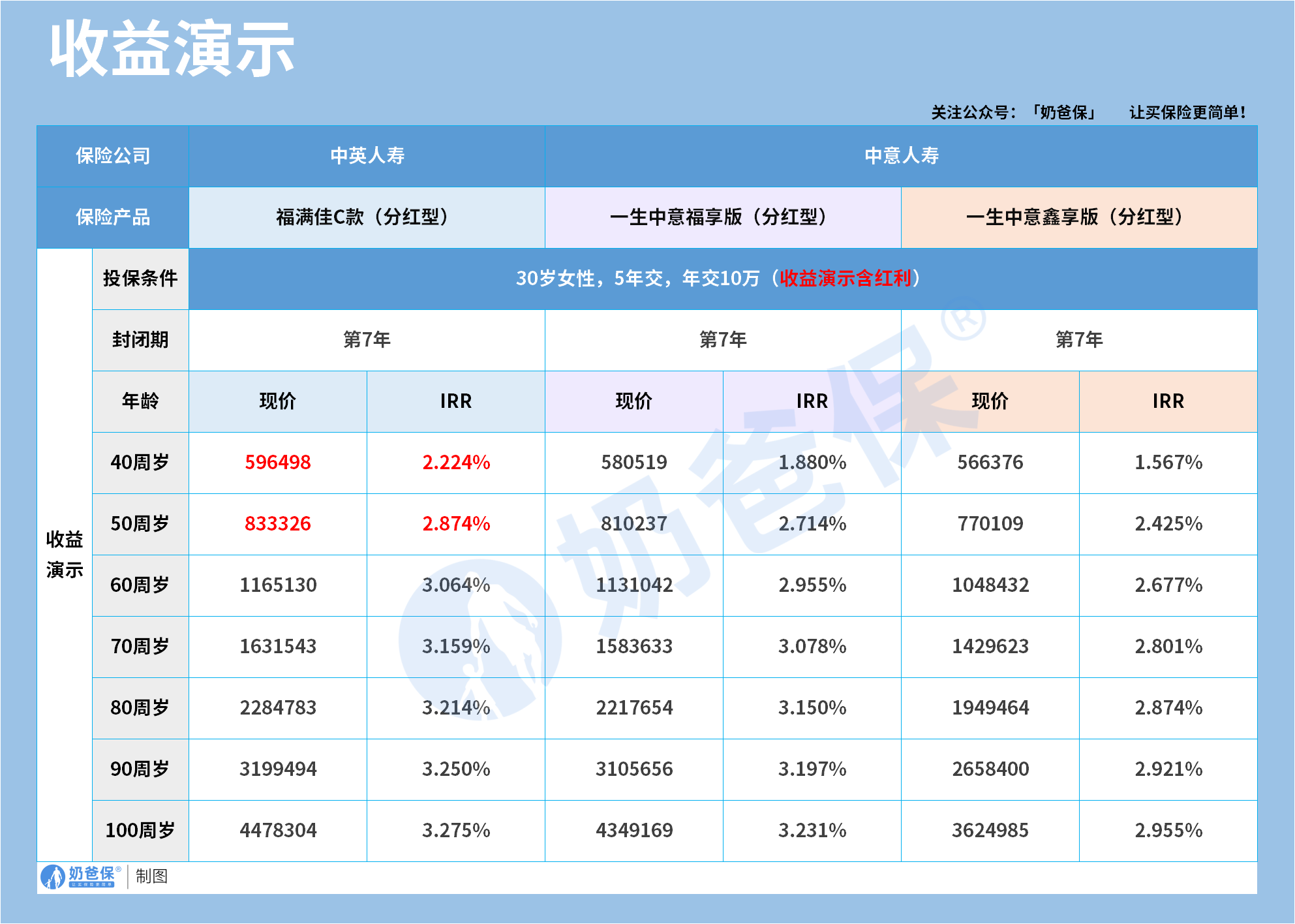 IRR逐步增长:40岁1.88%,50岁2.714%,60岁2.955%,80-100岁3.15%-3.231%;