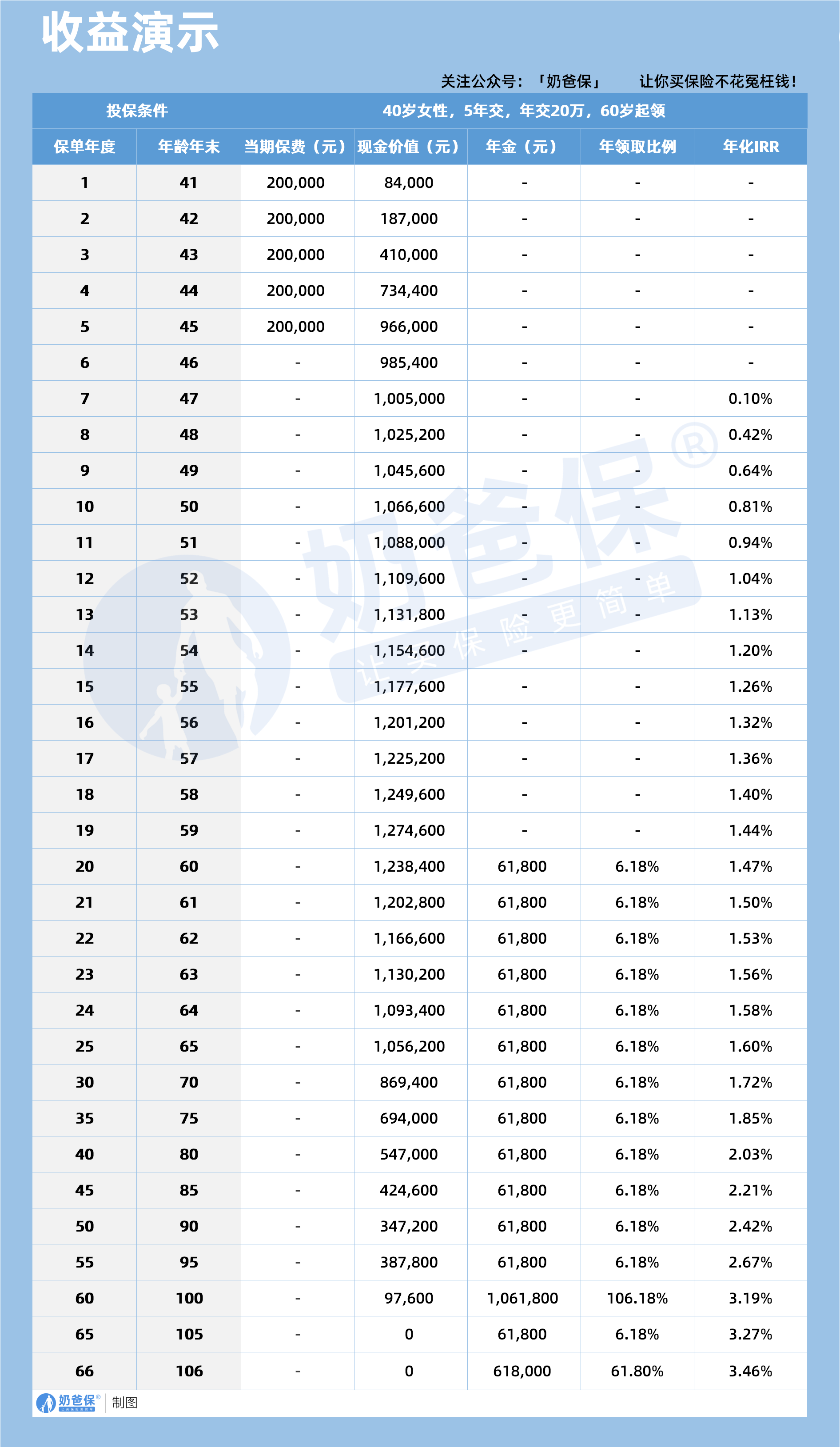 第55年年末(95岁)现金价值387800元,IRR2.67%。