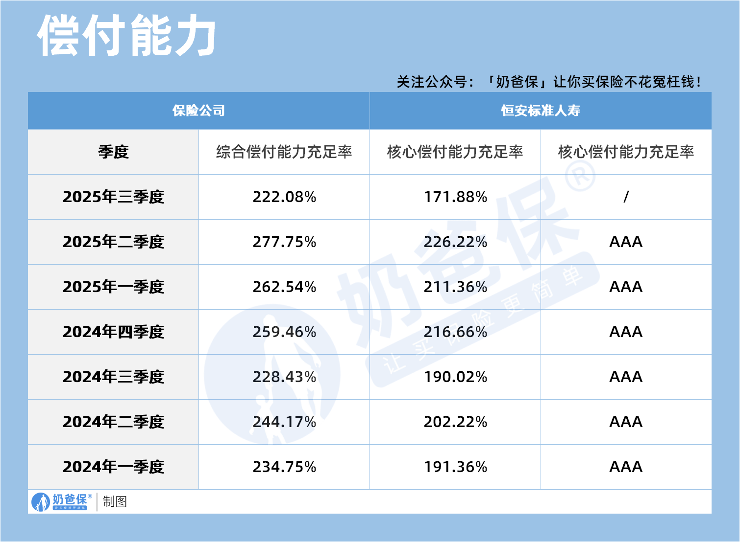 根据恒安标准人寿最新披露的2025年三季度数据,公司综合偿付能力充足率为222.08%,核心偿付能力充足率为171.88%,远高于监管要求的综合偿付能力充足率不低于100%、核心偿付能力充足率不低于50%的标准。