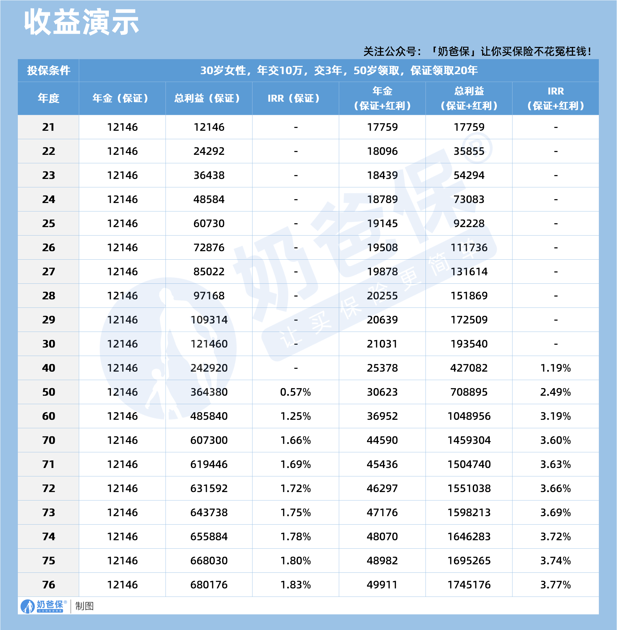 到50岁时,累计领取的确定总利益为364380元,对应IRR为0.57%;到60岁时,累计确定总利益达到485840元,IRR提升至1.25%;