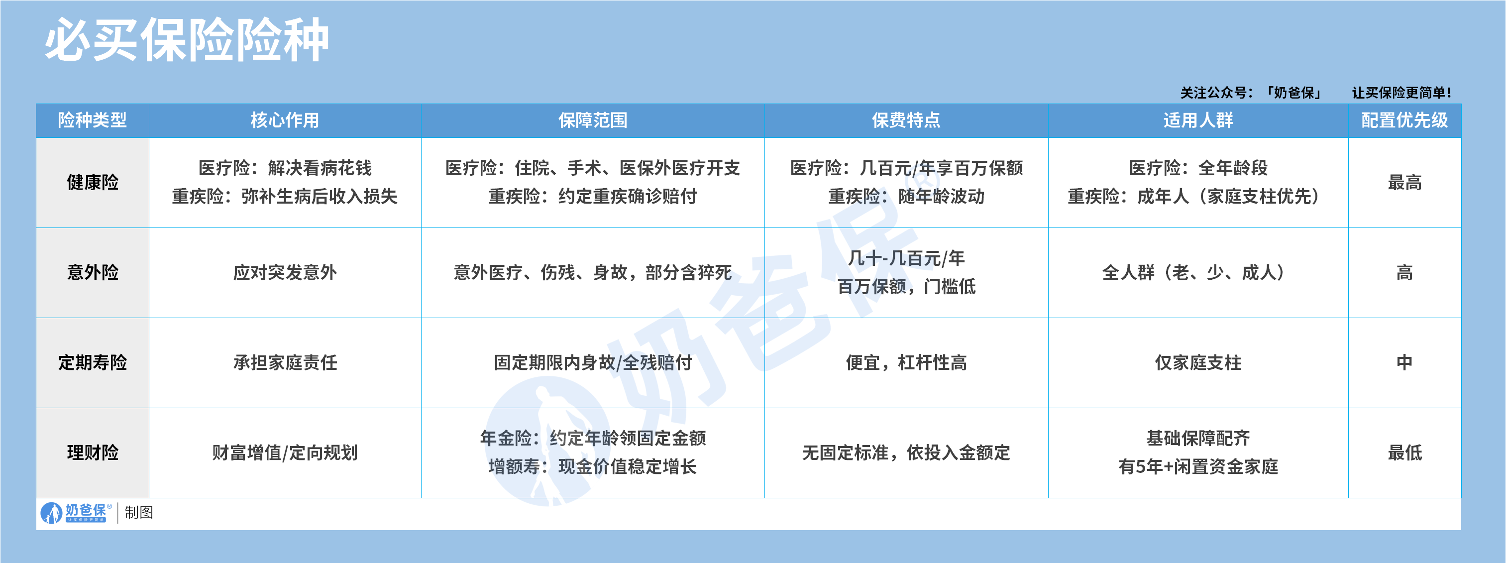 接下来,奶爸将从风险优先级出发,明确“必买”和“可选”的保险险种,