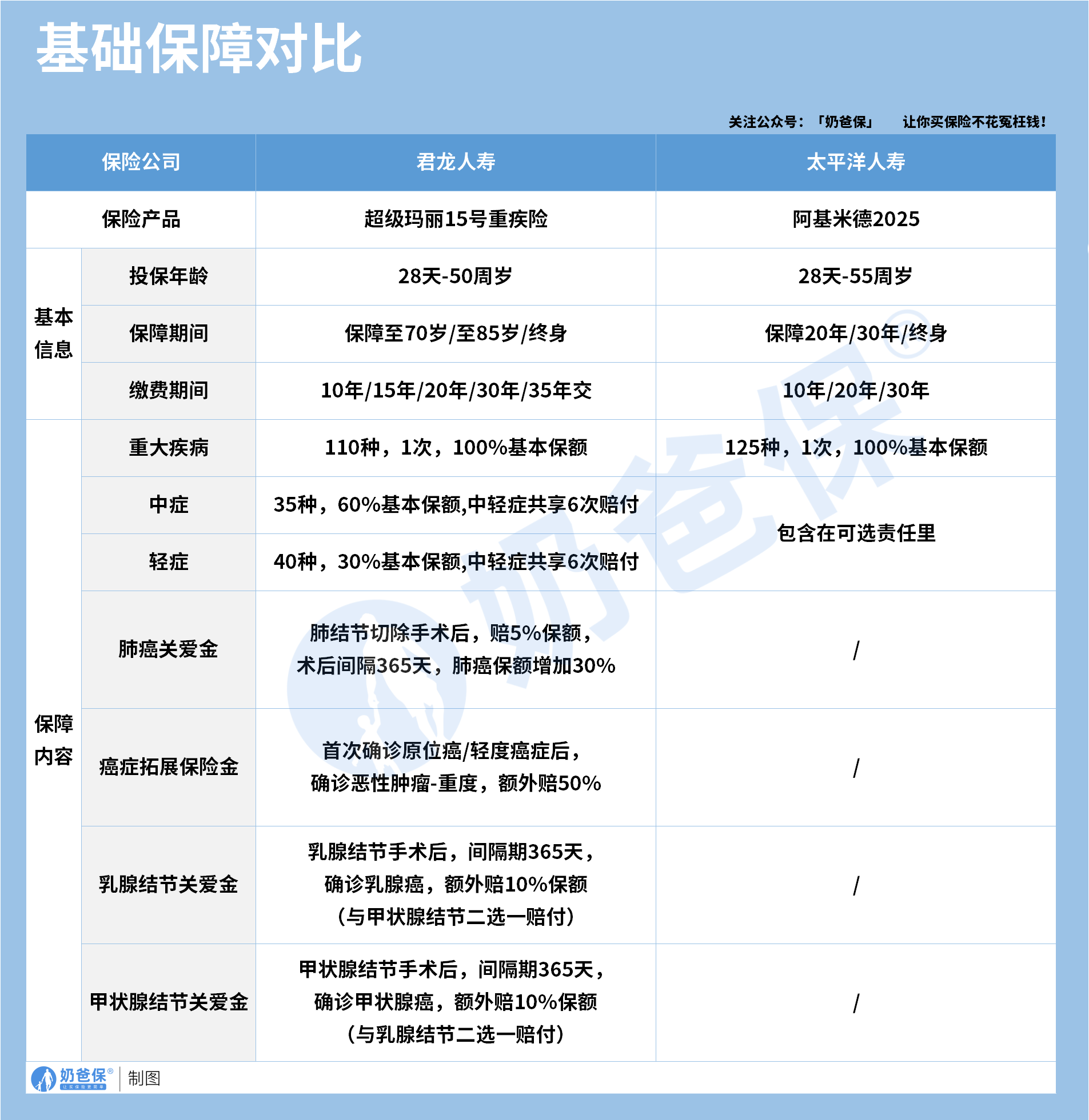 今天我们就以君龙人寿超级玛丽15号重疾险与太平洋人寿阿基米德2025重疾险为例,