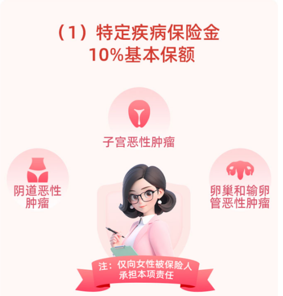产品针对女性独有的生殖系统肿瘤,设置了额外赔付机制,确诊四种女性特定疾病即可获得10%基本保额的额外赔付。