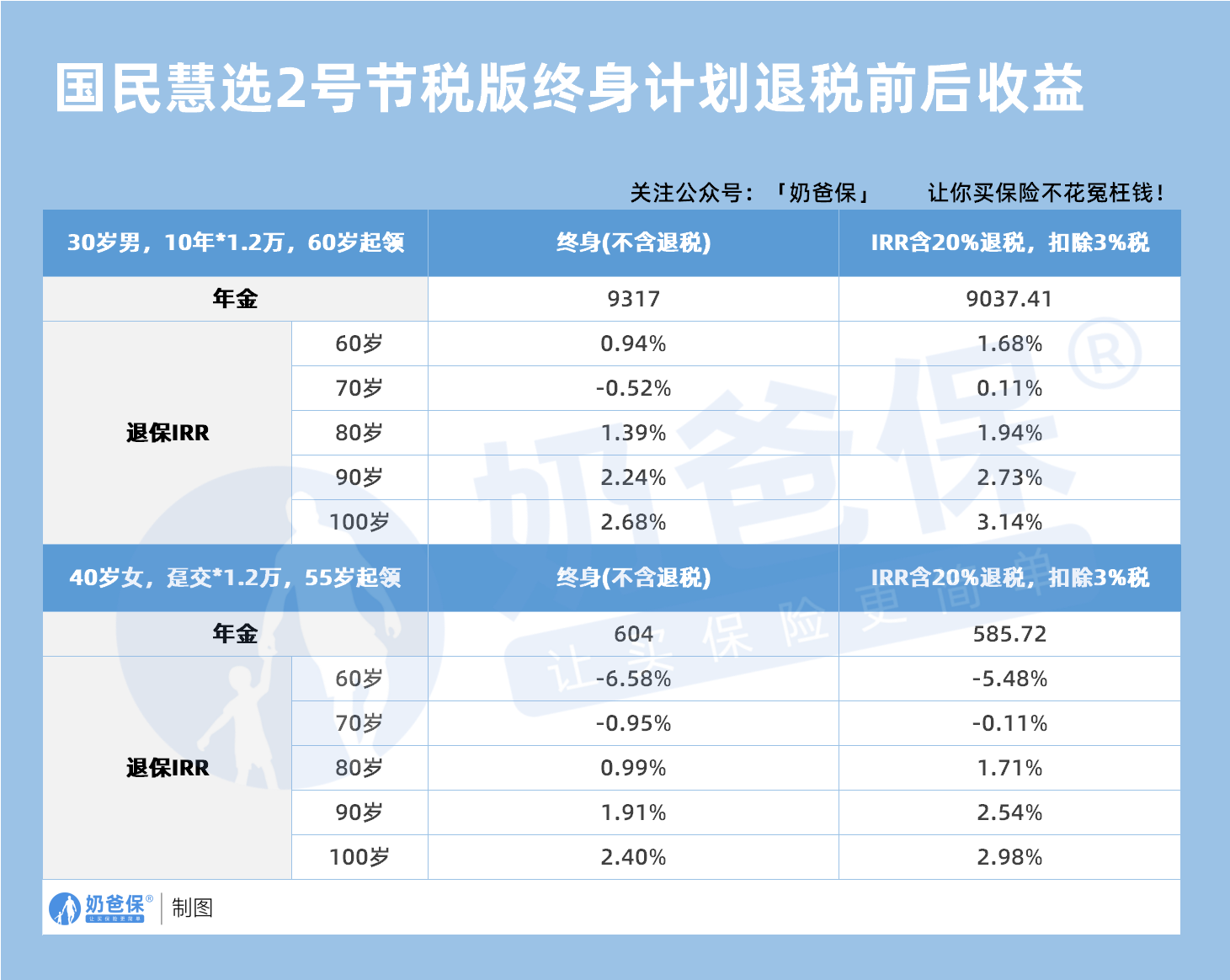 以 30 岁男性年交 1.2 万、10 年交为例,含退税的 IRR 在 100 岁时可达 3.14%,收益更可观。