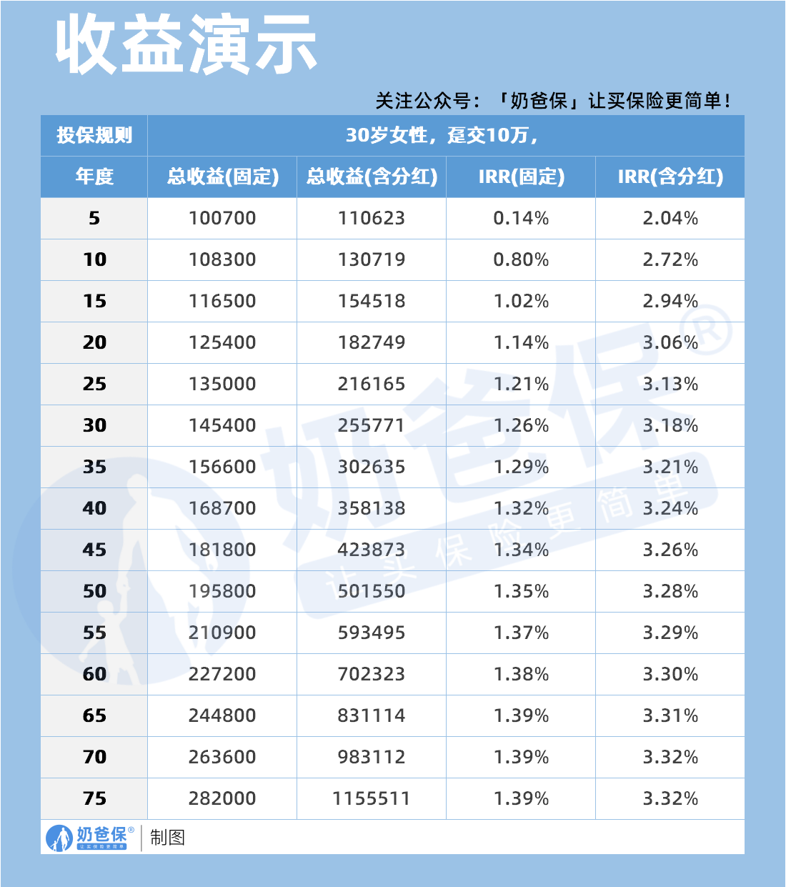 虽然单看固定部分的利率并不突出,但结合浮动分红后,整体收益的成长性会更具吸引力。含分红的总收益IRR在持有20年时达到3.06%,到75岁时稳定在3.32%左右,对应的总收益接近116万元。