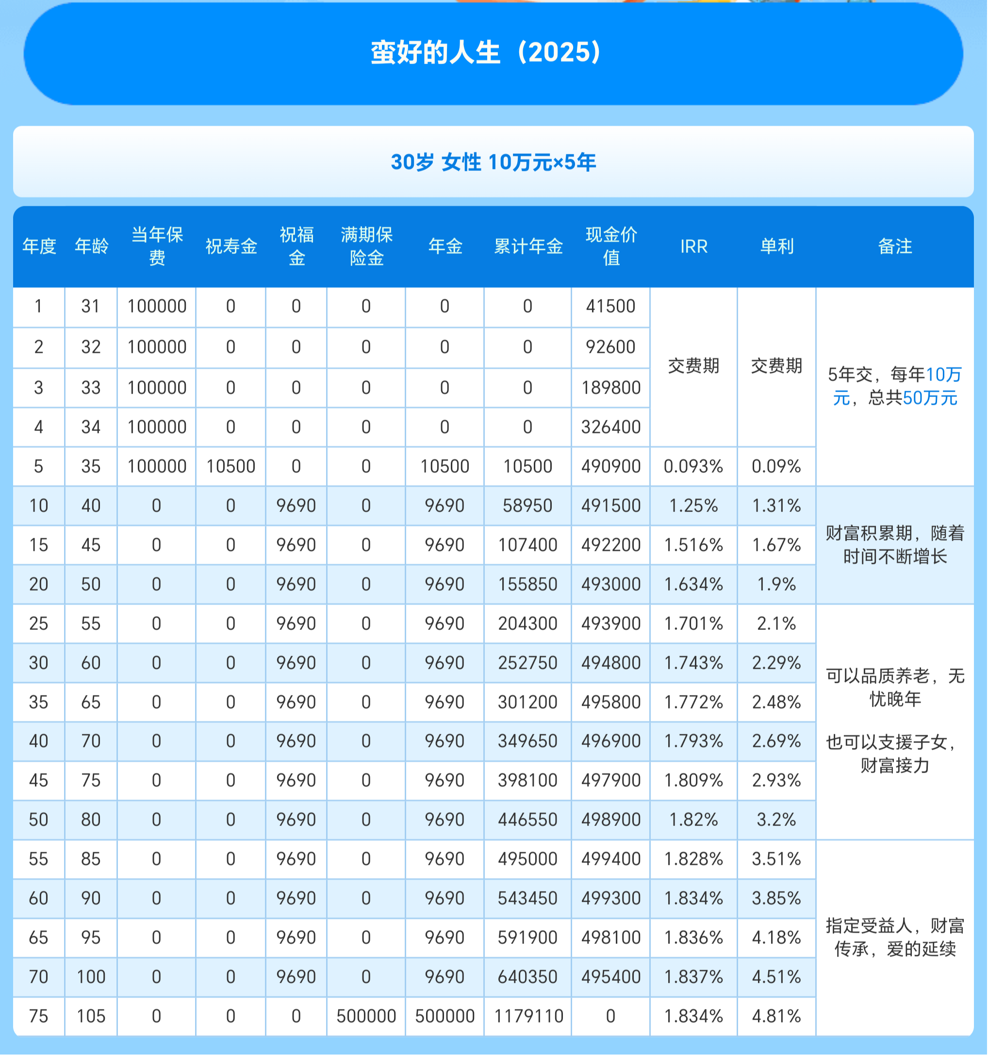 30岁女性,5年交,年交10万,