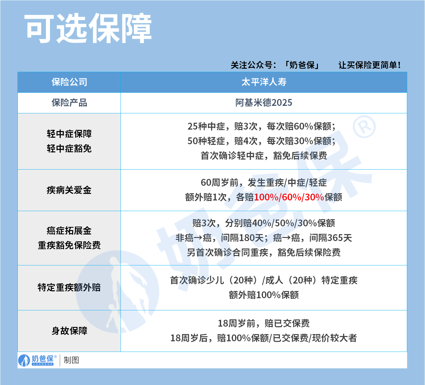 如果预算充裕,阿基米德2025重疾险有5种可选保障可自由组合,覆盖不同需求: