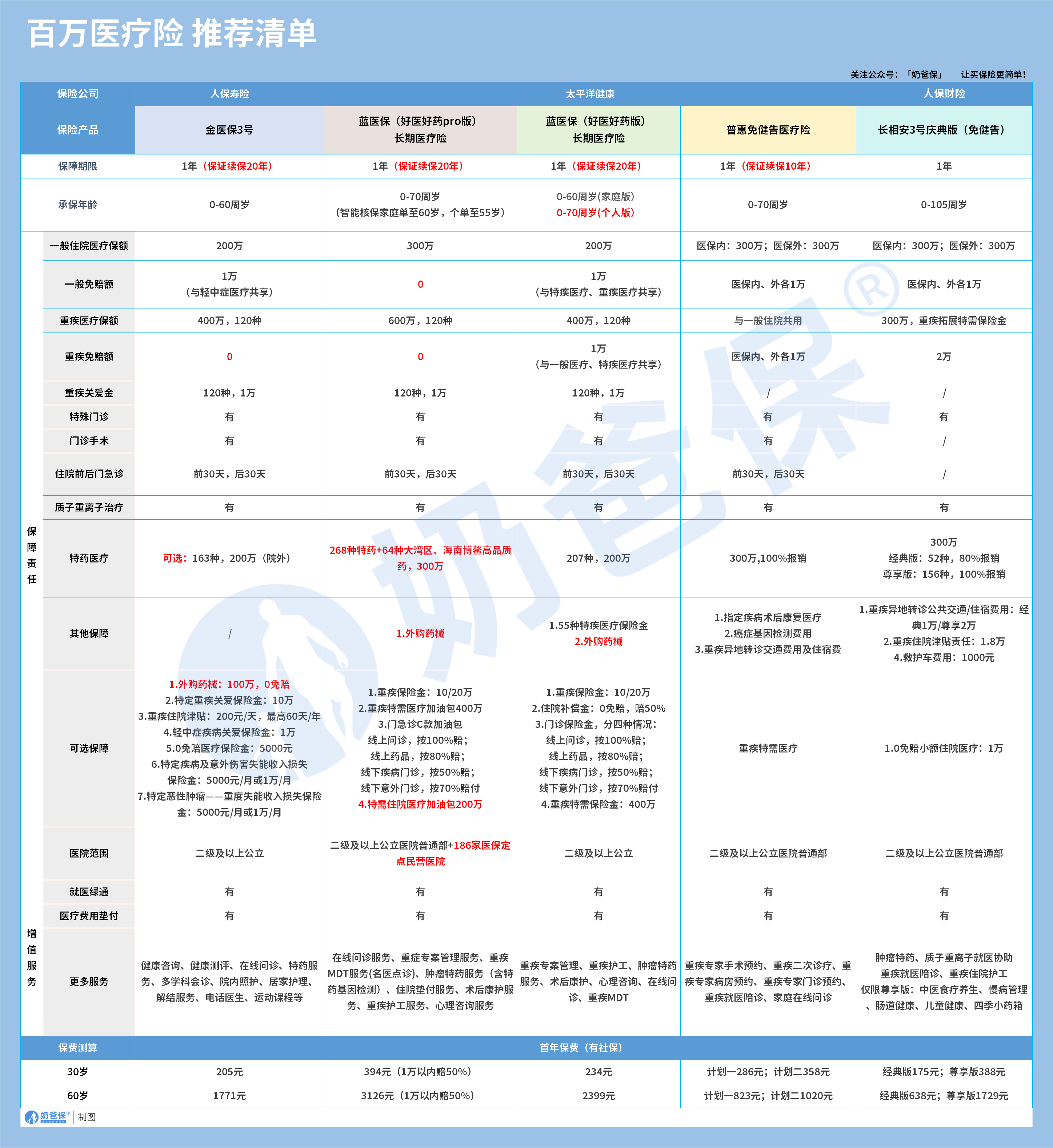 如果是健康人群投保,看中保证续保时长、保障全面性,推荐金医保3号、蓝医保(好医好药pro版)和蓝医保(好医好药版);