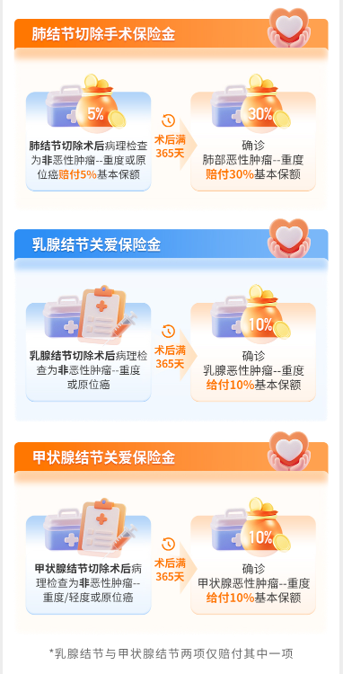 自带肺、甲状腺、乳腺结节关爱金(三者仅能三选一赔付),