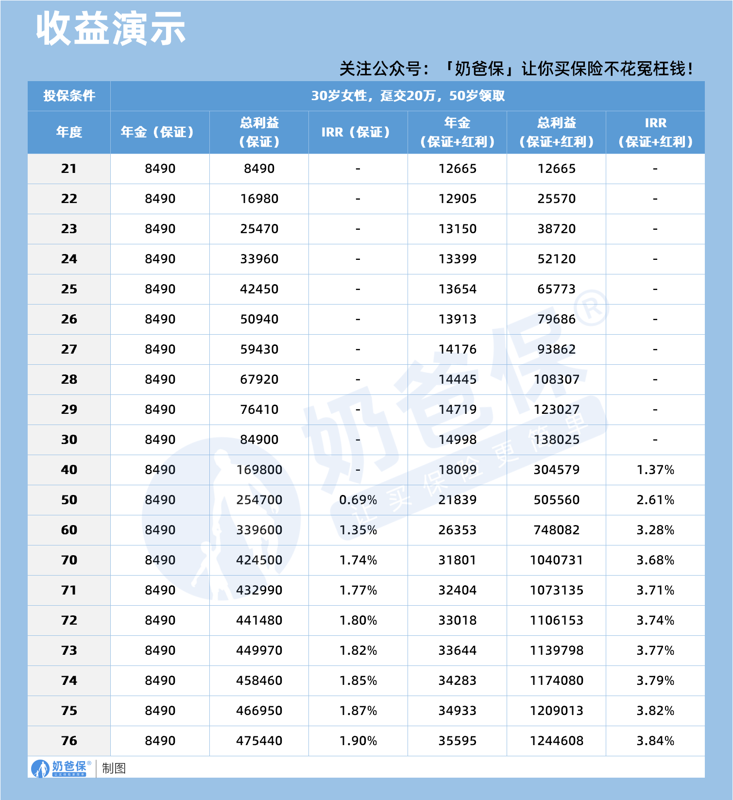 比如在产品的收益演示中,从50岁到76岁,