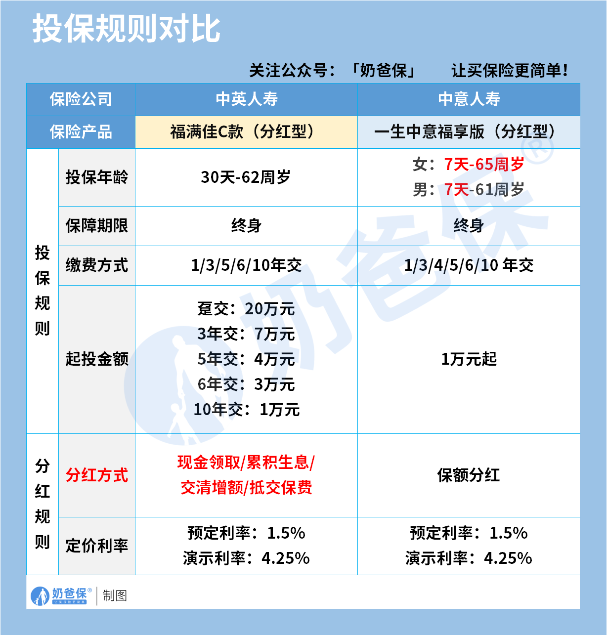 再看分红规则,两款产品预定利率都是1.5%,演示利率4.25%,但分红方式不一样。