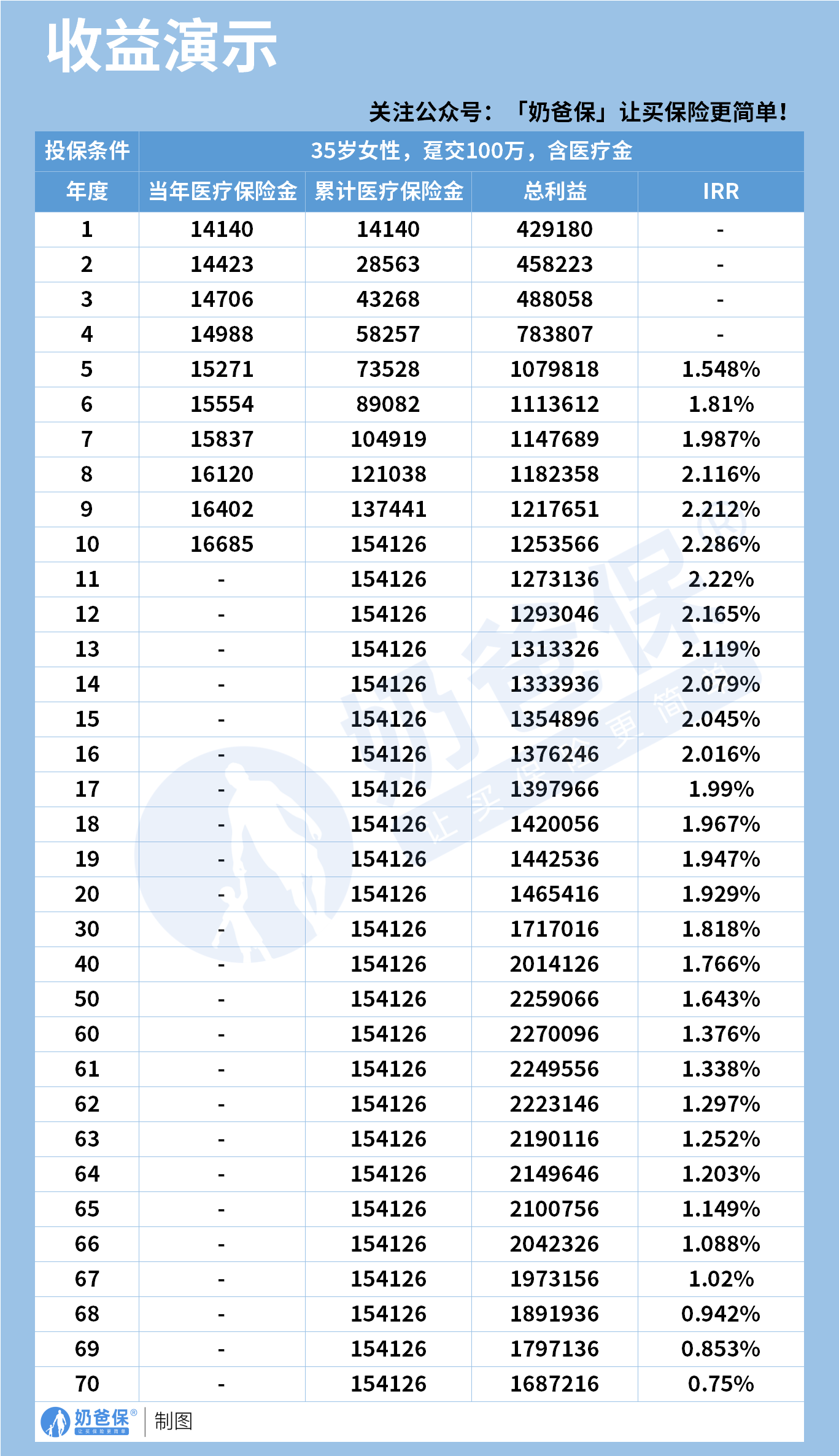 过了第10年,医疗金不再增加,总利益的增长就慢了下来,IRR也开始逐年下降。