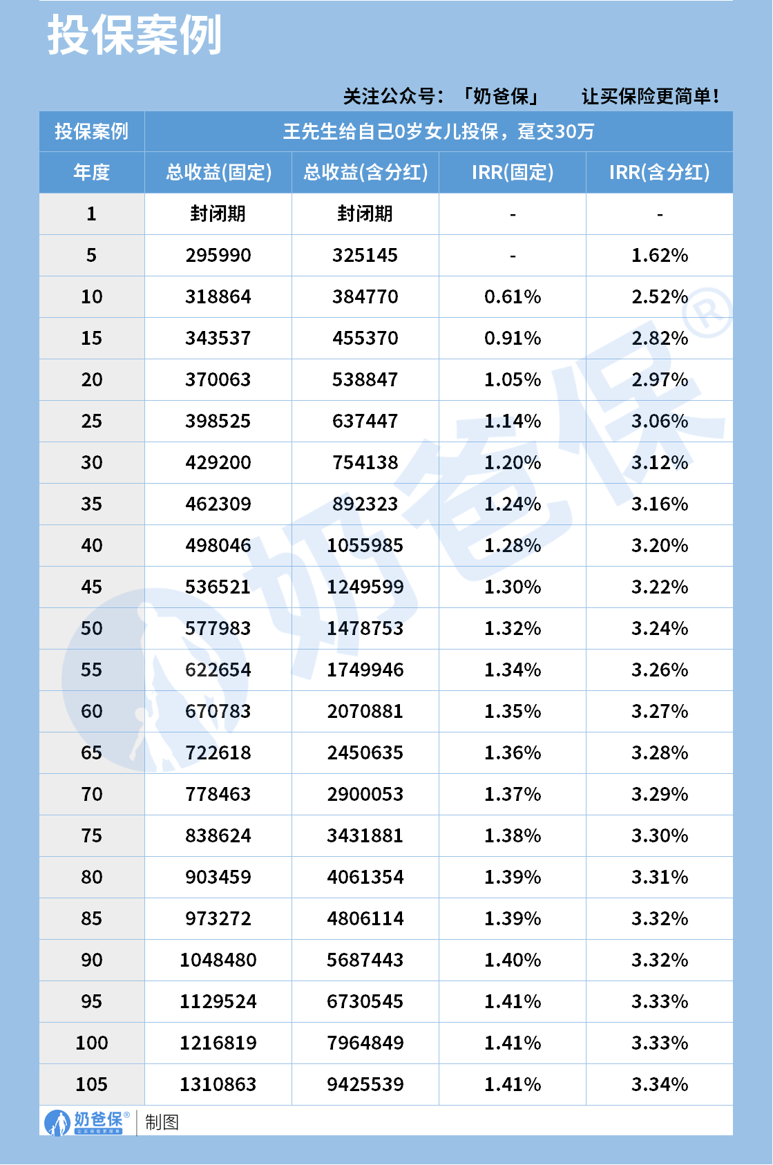 王先生打算给0岁女儿投保一份保单,选择的是趸交30万投保。