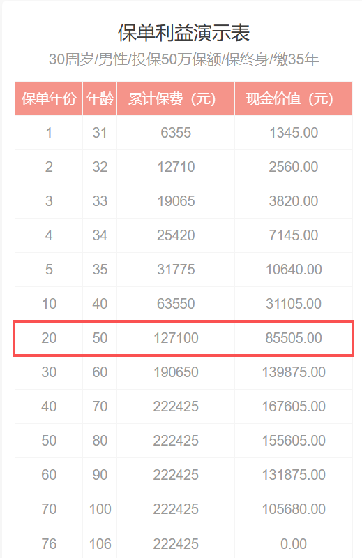 以30岁男性投保为例,选择50万保额、保终身、35年缴费,到第20个保单年度,