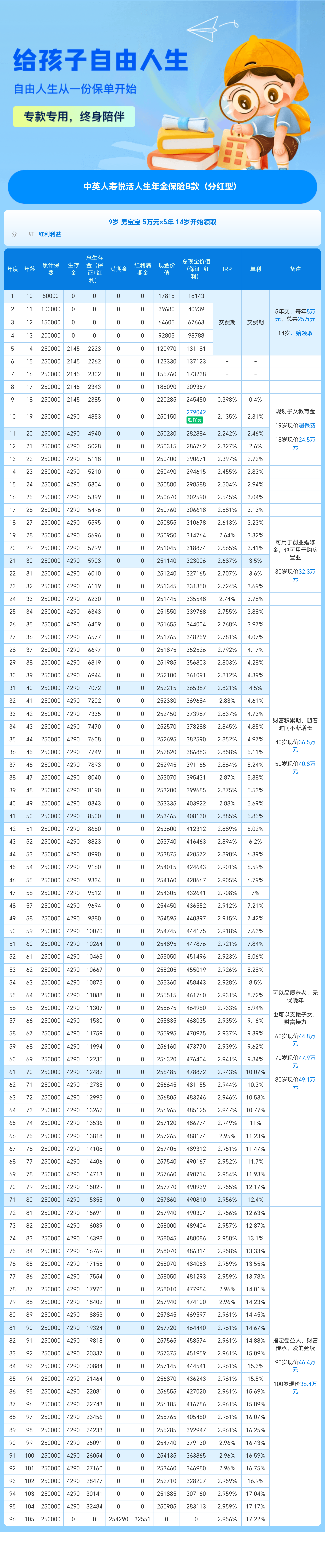 以9岁男孩,年交5万,交5年为例子: