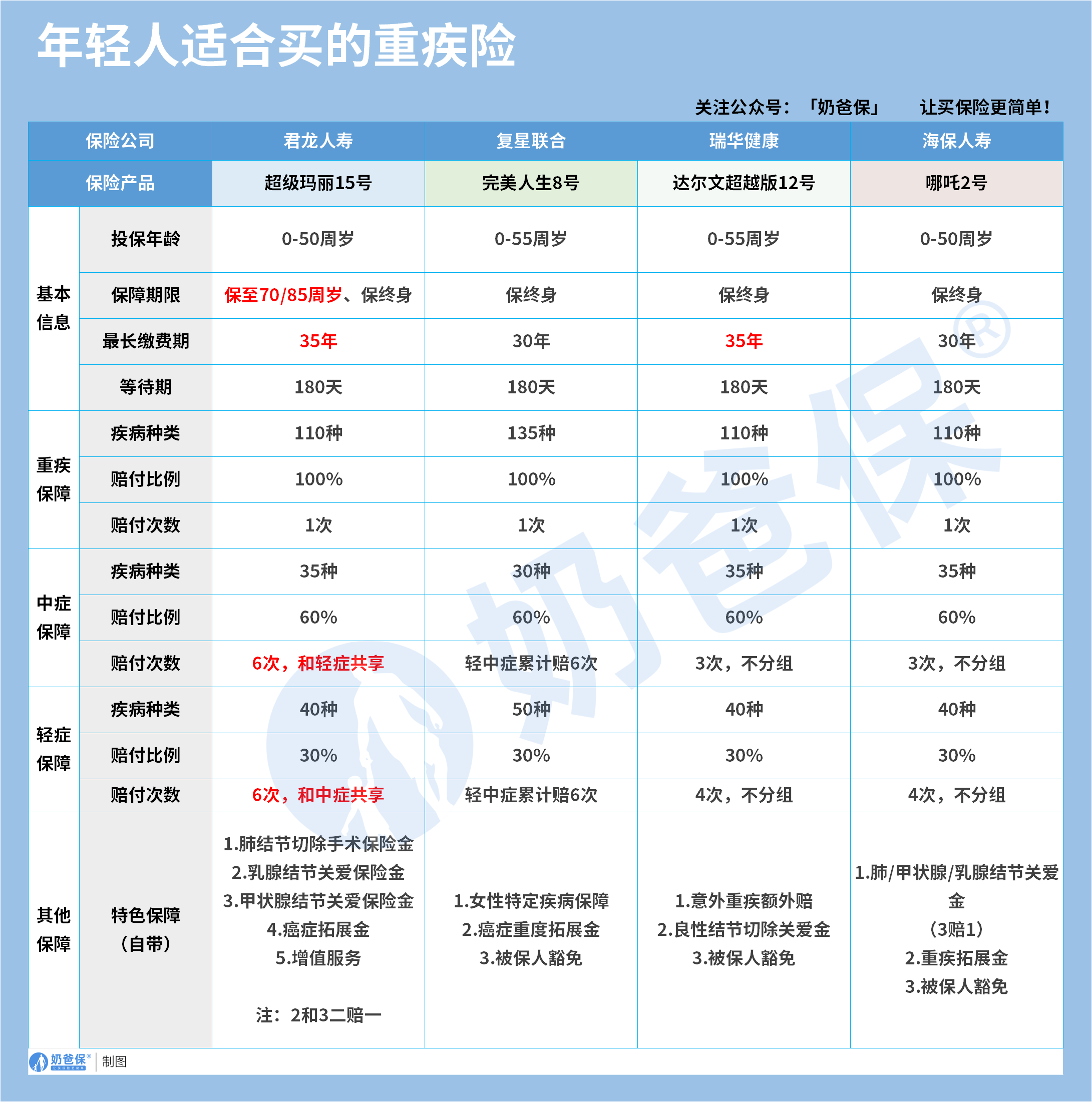 结合年轻人的预算、健康状况和职业特点,奶爸挑选了几款适配度很高的重疾险产品,不同需求的年轻人,都能在这里找到适合自己的那一款。