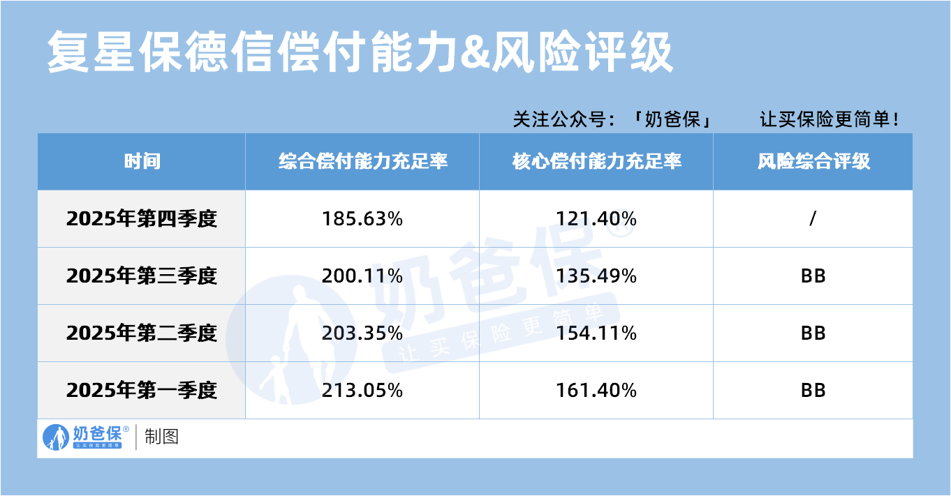 根据复星保德信人寿2025年的偿付能力数据,公司四个季度的综合偿付能力充足率均保持在185%以上。