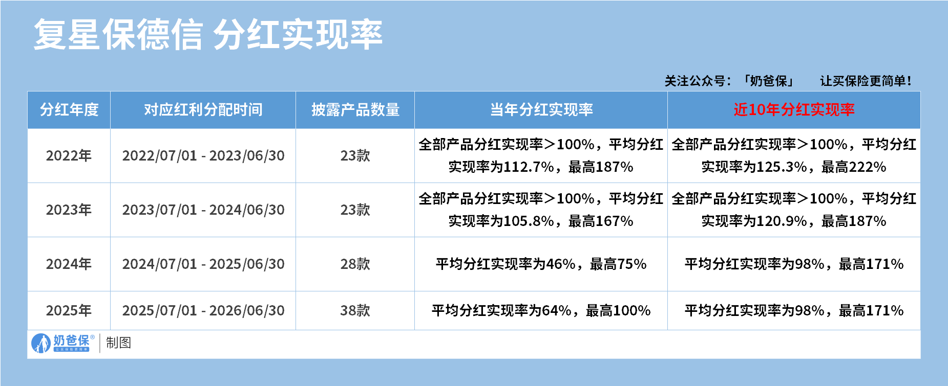 从复星保德信人寿的分红实现率数据来看,公司的分红表现长期保持优秀。