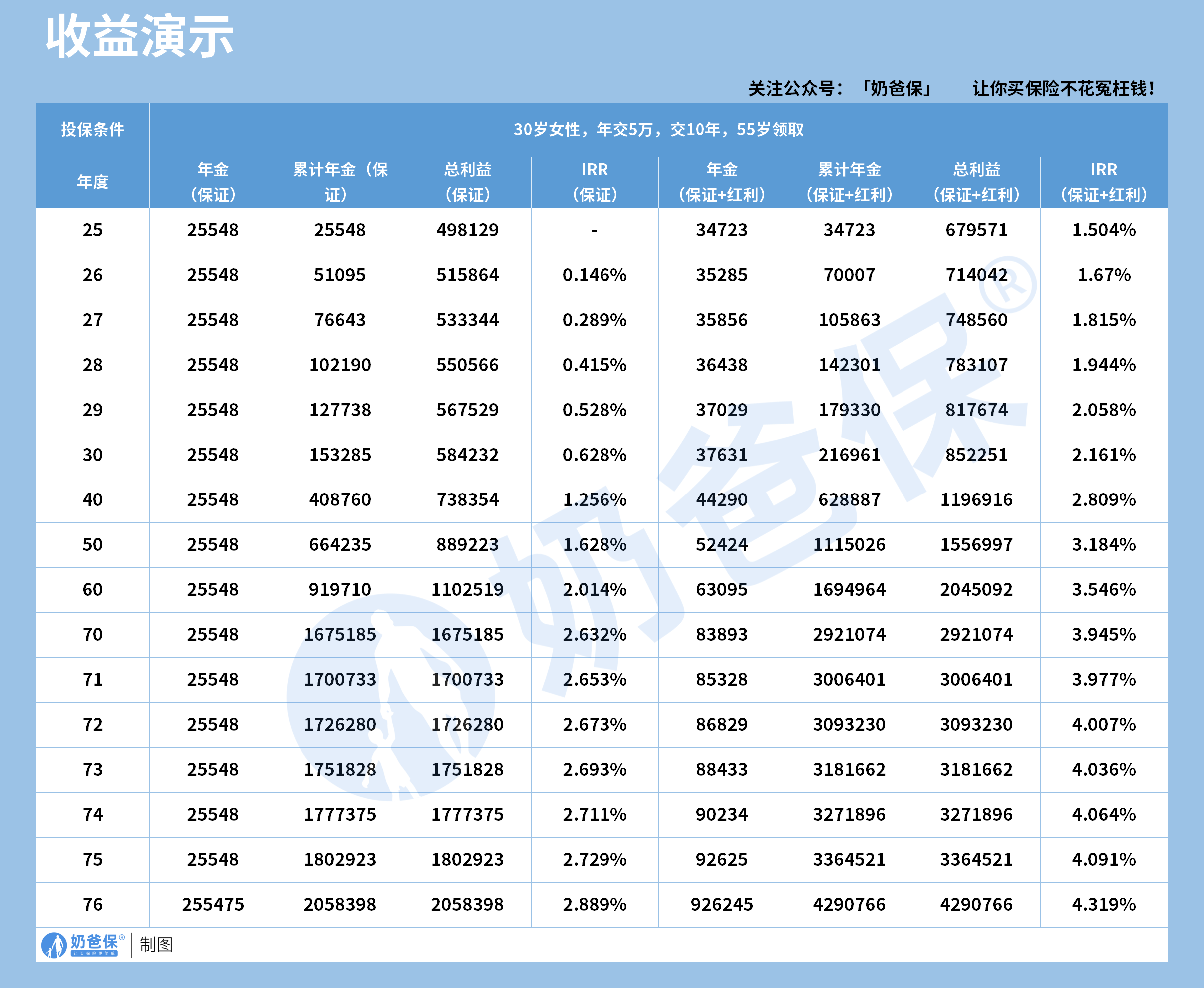收益表现方面,以30岁女性年交5万交10年55岁领取为例,为大家详细解读。