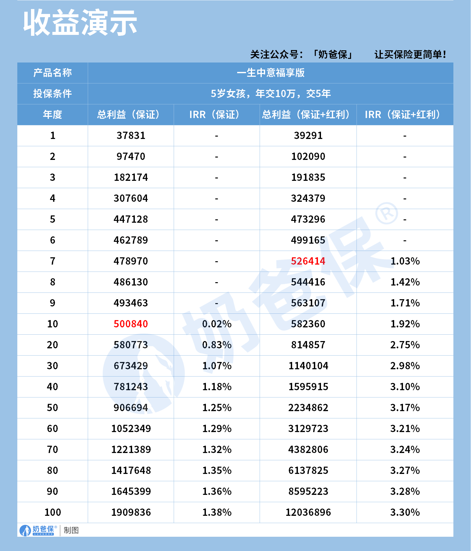 以5岁女孩年交10万,交5年为例,持有到第10年,