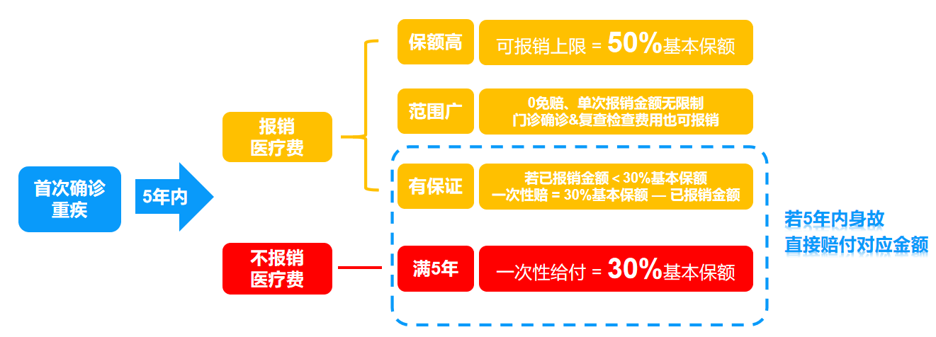 首次确诊重疾,自确诊之日起5年内因治疗重疾发生的住院医疗费用等,按照100%报销,最高赔50%保额。