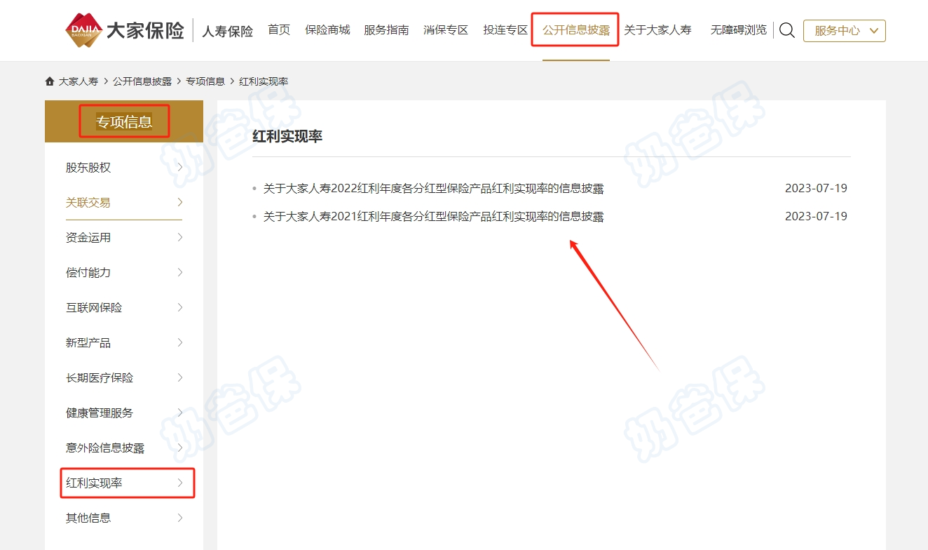 大家养老的分红实现率可以直接在官方网站“公开信息披露”-“专项信息”-“红利实现率”进行查询,给客户一定参考。