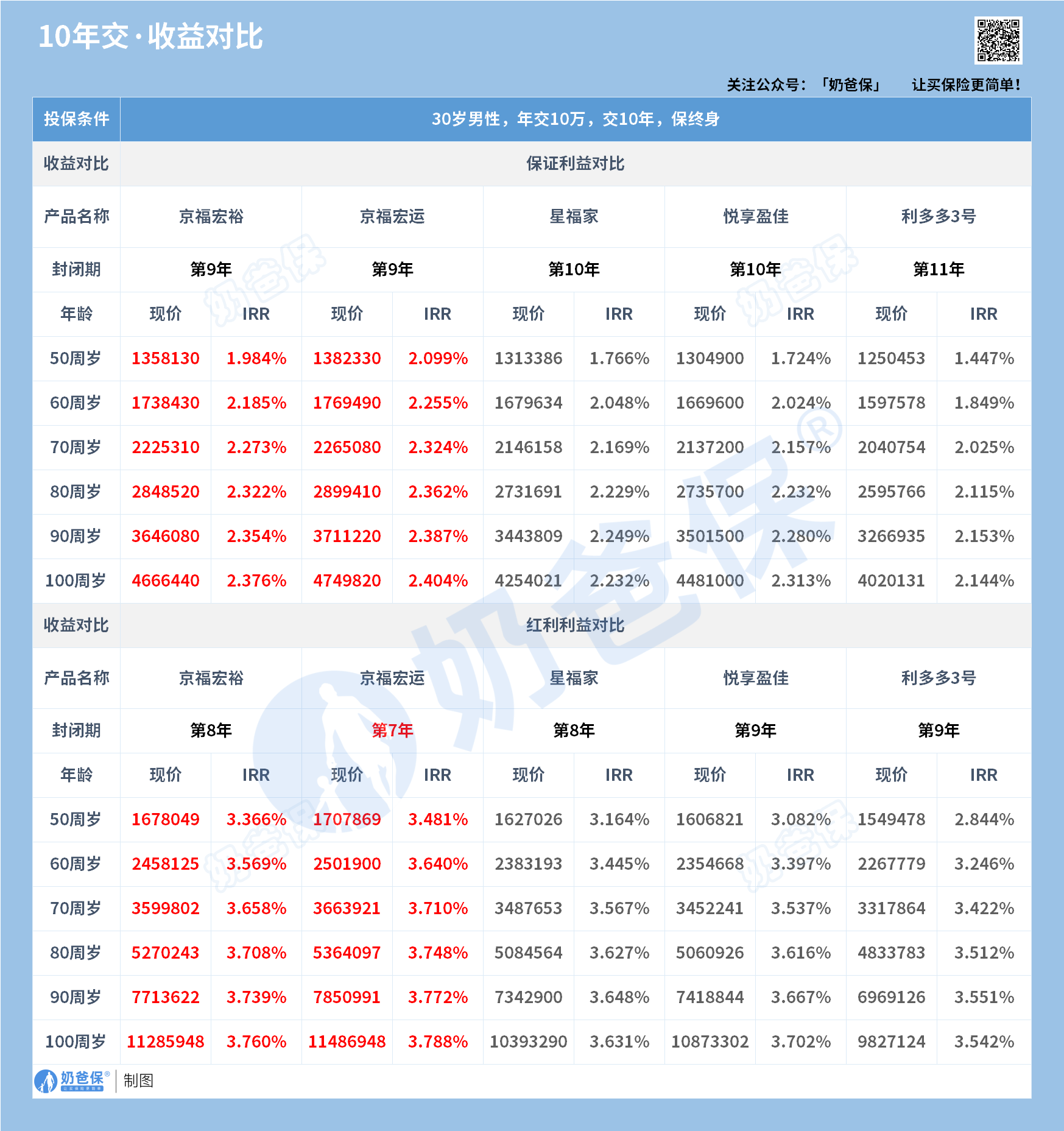 若是以30岁男性,年交10万交10年的投保条件进行测算,收益情况如下: