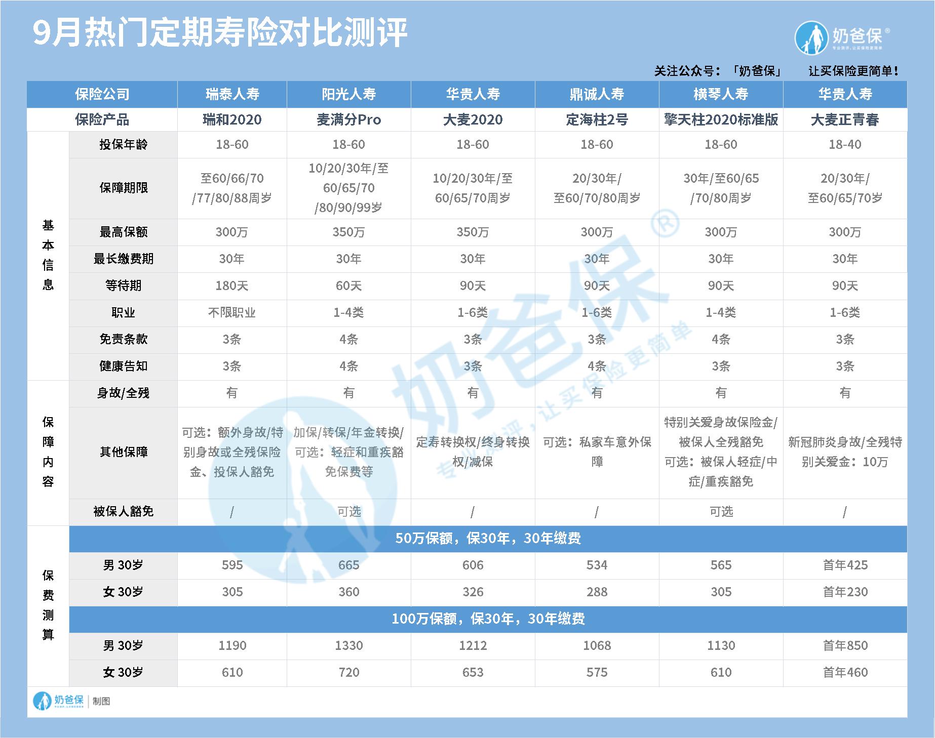 奶爸整理了一张定期寿险对比测评表格,我们来看一看: