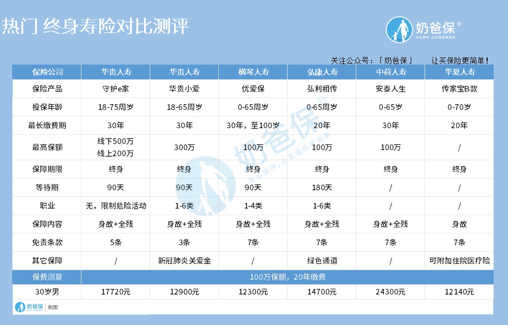 奶爸直接给出结论:1.追求更广的保障范围:瑞泰瑞和2020这款产品在常规的身故/全残保障的基础上,还可选附加身故/全残/特别身故额外保险金,同时还附加投保人豁免。投保人豁免即投保人不幸罹患合同约定的疾病身故/全残,后续保险所需保费全部豁免。2.追求性价比:鼎诚定海柱2号,横琴擎天柱2020以及华贵大麦正青春这几款产品在同等保额的情况下,价格更便宜,性价比较高。华贵大麦正青春这款产品首年投保的保费是最便宜的,但后续保费会以每年3%增长。3.追求保额:麦满分Pro和华贵大麦2020这两款产品的最高保额可达350万,保额算是同类产品中较高。不知道怎么买定期寿险的朋友,可以看奶爸写的《定期寿险怎么买?哪款产品好?》一文。02什么是终身寿险下面我们来看一看几款热门终身寿险的测评对比: