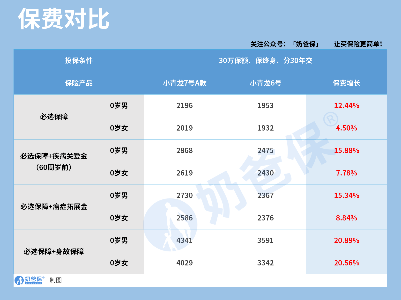 保费方面,以“30万保额、保终身、分30年交”为例,小青龙7号A款较之前的小青龙6号有不同幅度上涨: