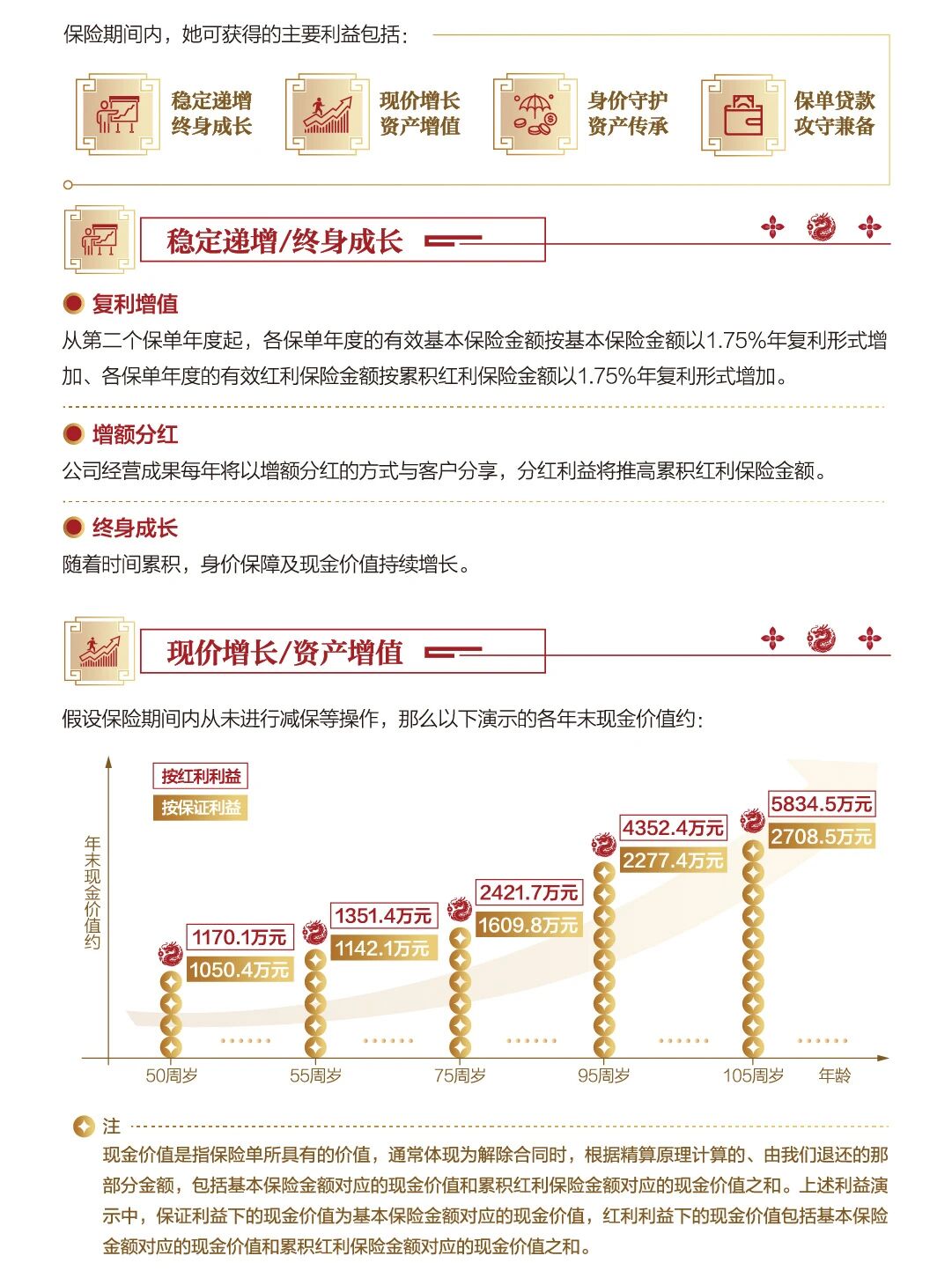 同时每年可享增额分红(分红依公司经营情况浮动),红利会累积为红利保额再参与复利增值。以 40 岁张女士年交 350 万、3 年交为例,演示中 50 岁现金价值超 1050 万,105 岁可达 5834.5 万,长期持有下资产增值性突出。