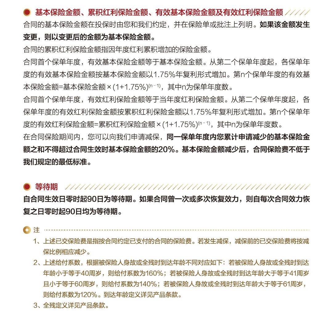 产品自带 “确定 + 浮动” 的双重增值属性:从第 2 个保单年度起,有效基本保额、有效红利保额均按1.75% 年复利增长(这部分是合同约定的确定收益);