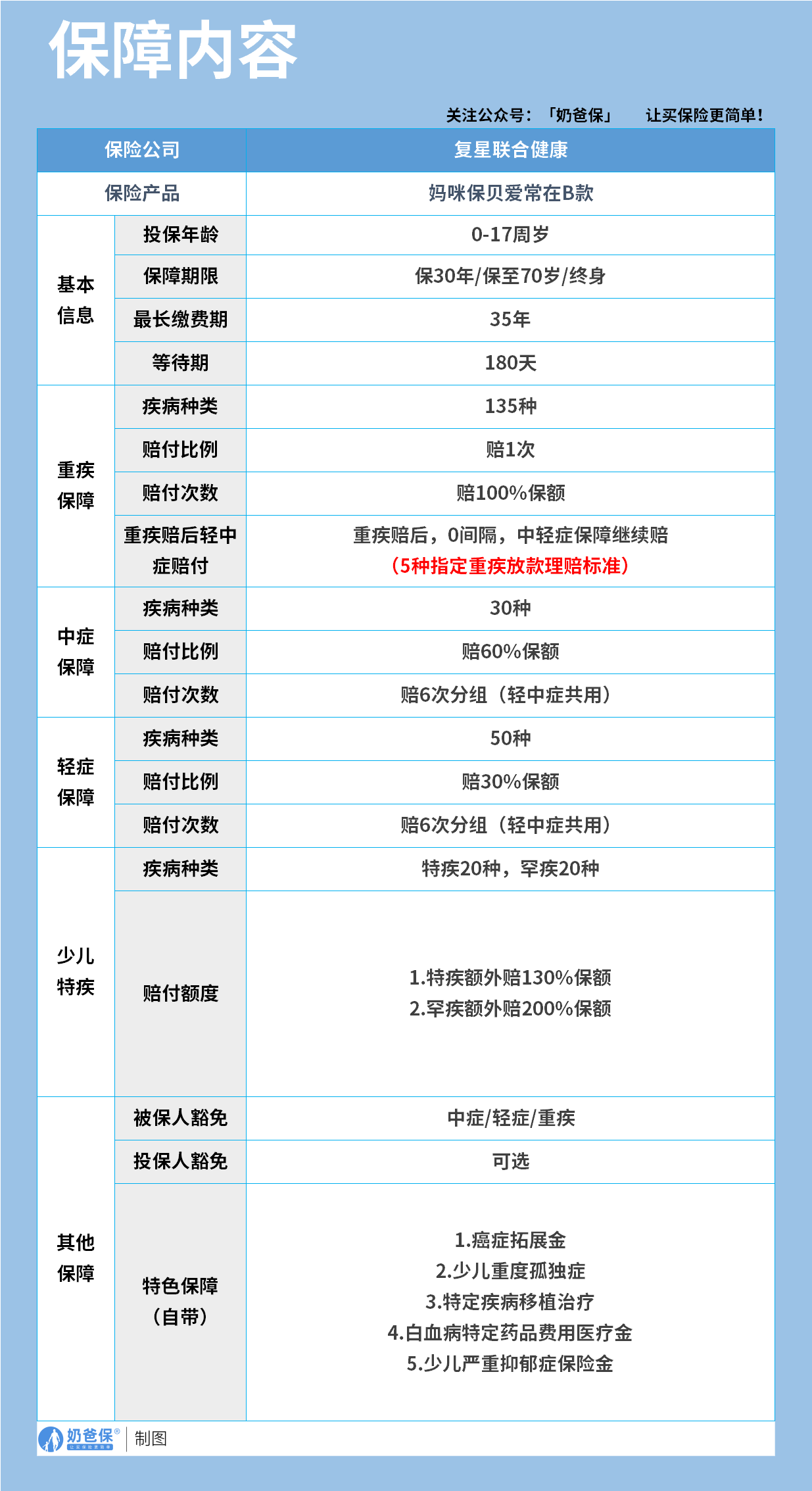 妈咪保贝爱常在 B 款是复星联合健康推出的少儿重疾险,保障覆盖全面且少儿适配性突出,具体保障如下: