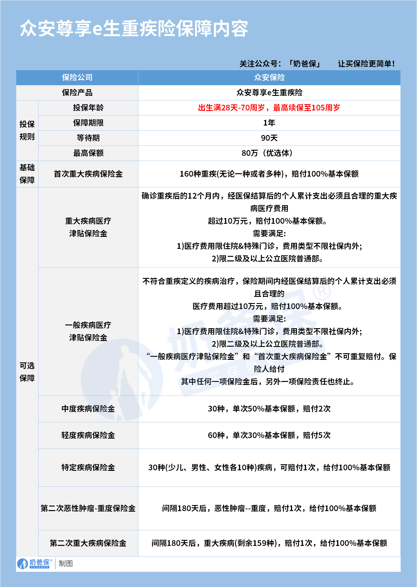 众安尊享 e 生重疾险是众安保险推出的1 年期短期重疾险,保障责任丰富、保额上限高,但需注意其 “短期险” 的属性限制,具体保障特点可从以下维度解析: