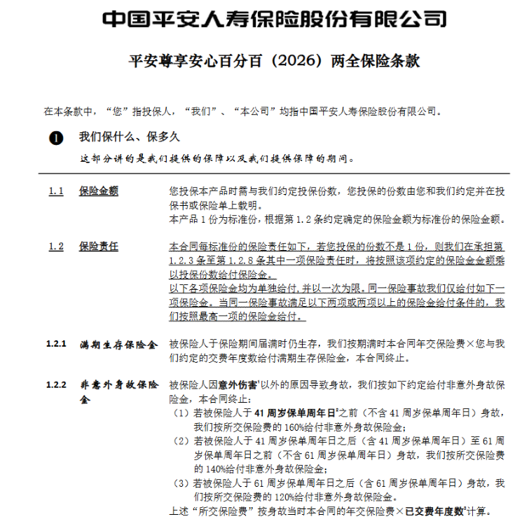 一、平安尊享安心百分百(2026)两全保险保障怎么样?