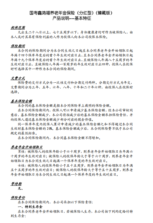 国寿鑫鸿福养老年金保险(分红型)(臻藏版)以养老规划为核心,兼顾保障与财富增值,为被保险人提供全周期的生存及身故保障,同时支持灵活规划与红利分享,具体保障内容如下: