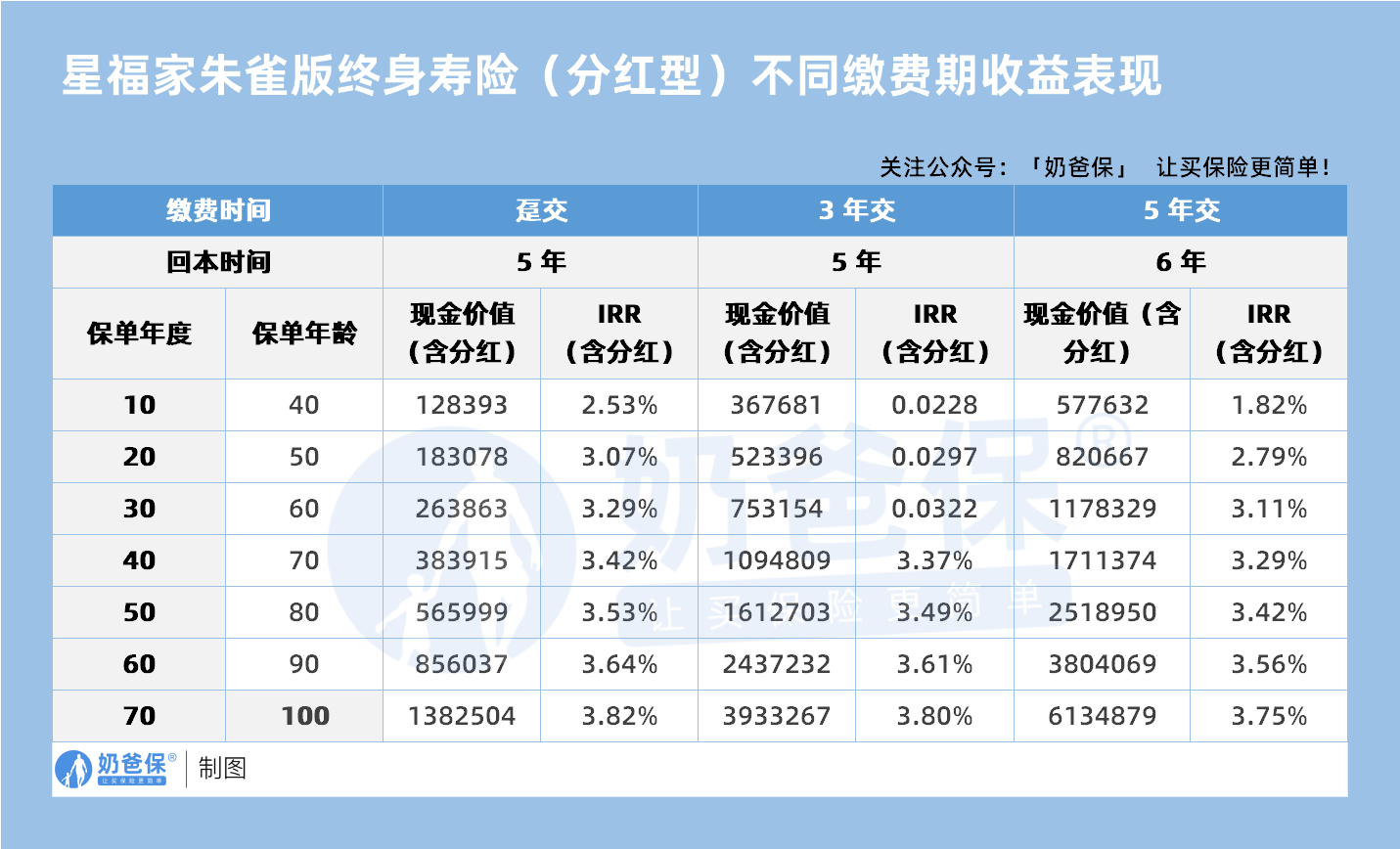 3 年交模式下,持有 70 年 IRR 为 3.80%;5 年交模式下,持有 70 年 IRR 为 3.75%。