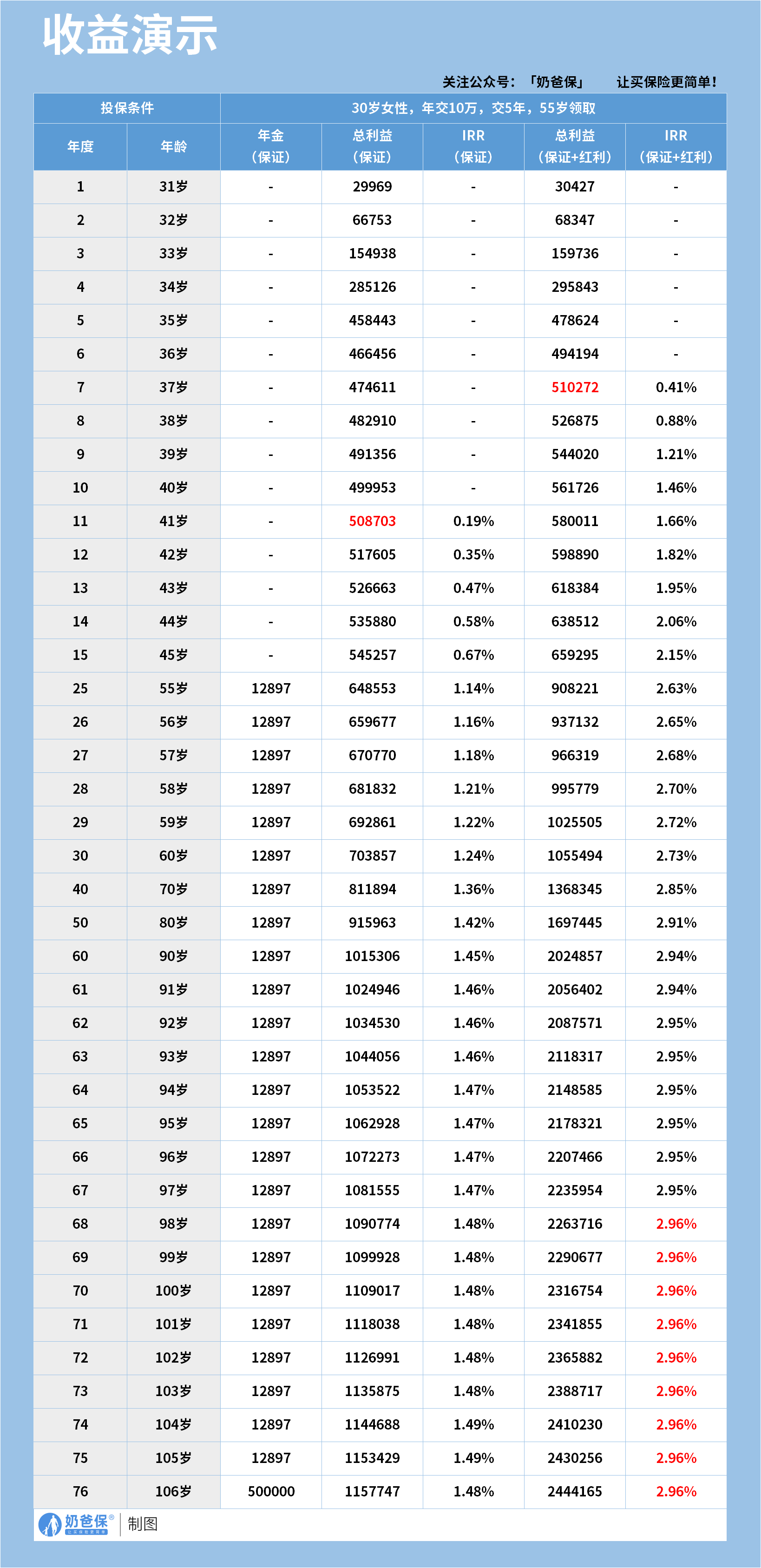 收益表现上,产品分为保证收益与分红两部分。从演示数据看,30 岁女性年交 10 万、交 5 年、55 岁领取的情况下,