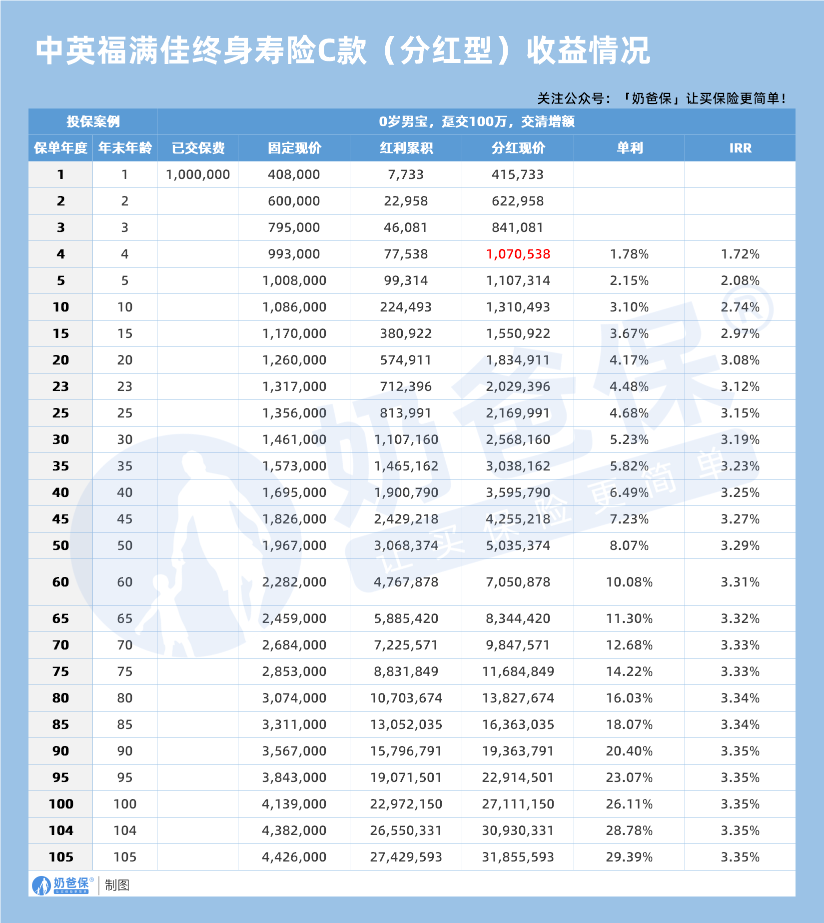 第 20 年达 126 万元,20 年累计增长 26%;持有至 50 年时,固定现价为 196.7 万元,实现本金翻倍;若持有至 100 岁,固定现价可达 413.9 万元,是初始本金的 4.14 倍。