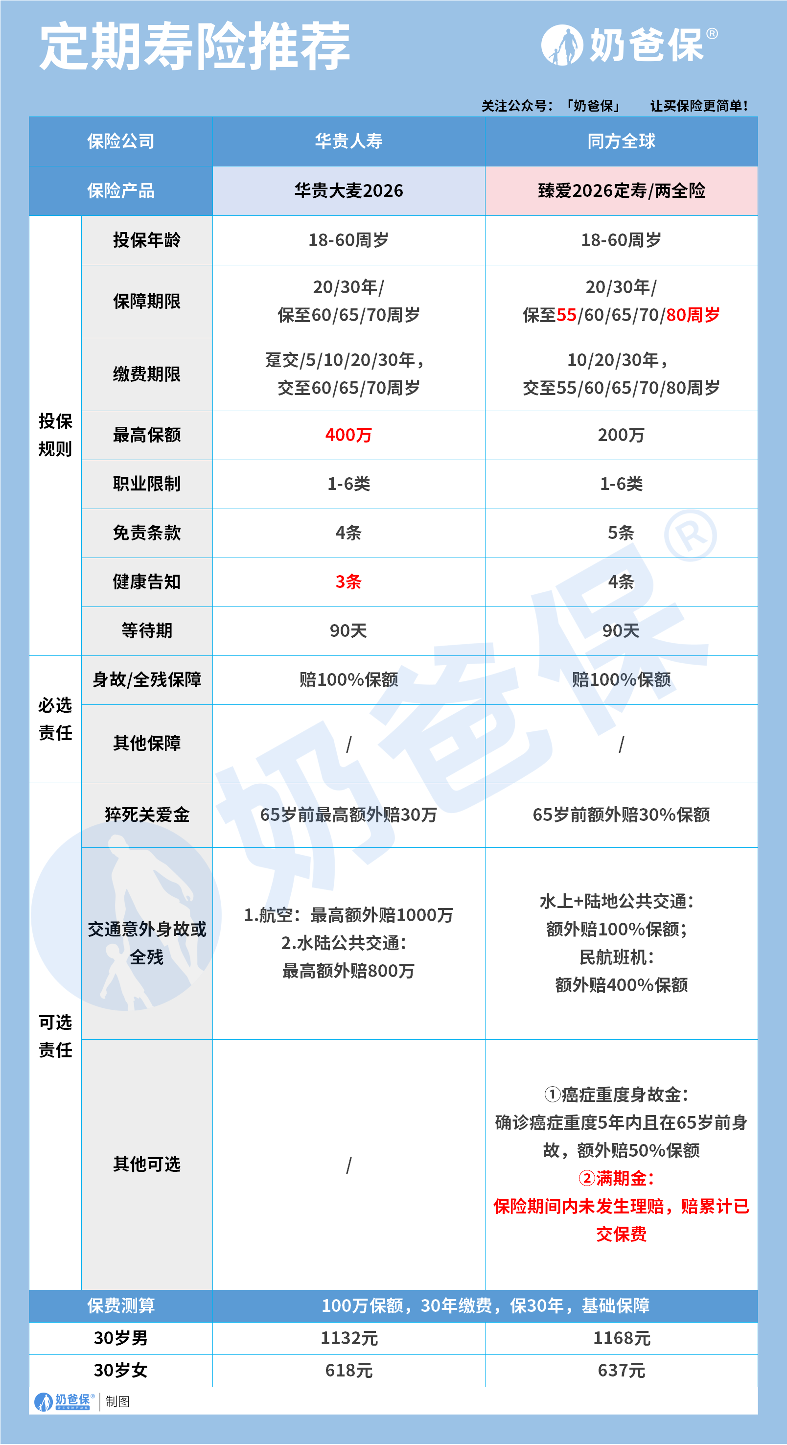 此外,缴费期限、产品责任也会影响价格:选择 30 年缴费比 10 年缴费的年缴压力更小;带满期返还、癌症额外赔付等可选责任的产品(如同方全球臻爱 2026),保费会略高于纯保障型产品。